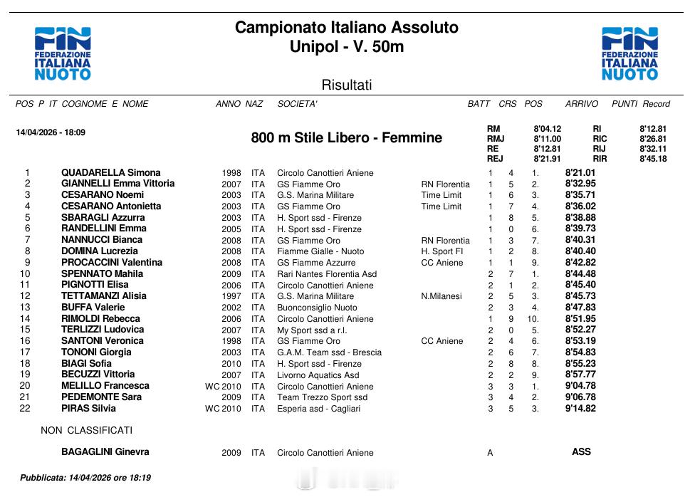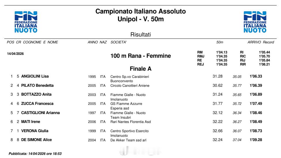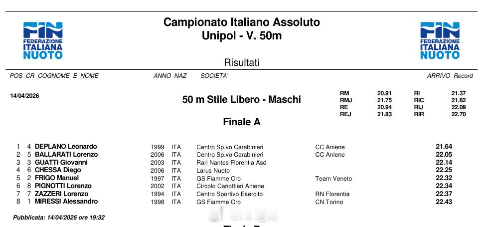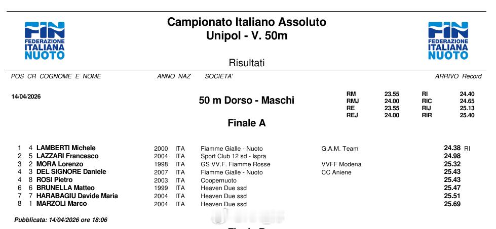 意大利游泳锦标赛 第一天决赛男50仰:Michelle Lamberti 24.38 NR男50自:Leonardo Deplano 21.64男50蝶:Lorenzo Gargani 23.31女800自:Simona Quadarella 8:21.01女100蛙:Lisa Angiolini 1:06.33