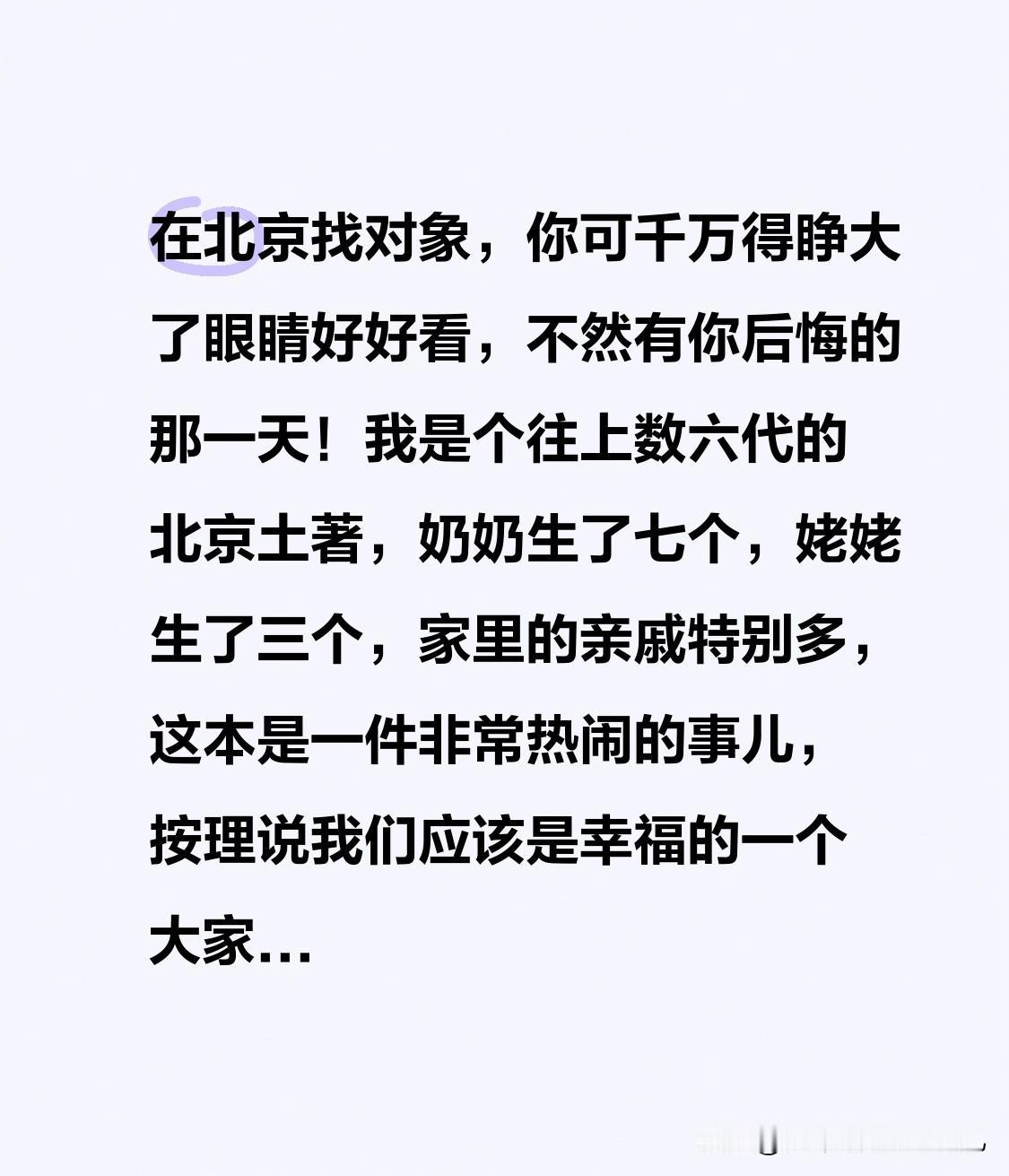 老公虽然是个外地的,但是我想说我并不认为他找北京人结婚有什么可让人羡慕的,我很同情我的爱人,我劝大家以后别再觉得找北京人结婚有什么好的了,找北京人结婚之前先看看她们家亲戚多不多再说吧,不然有那么一天真的会让你奔溃到极致的!