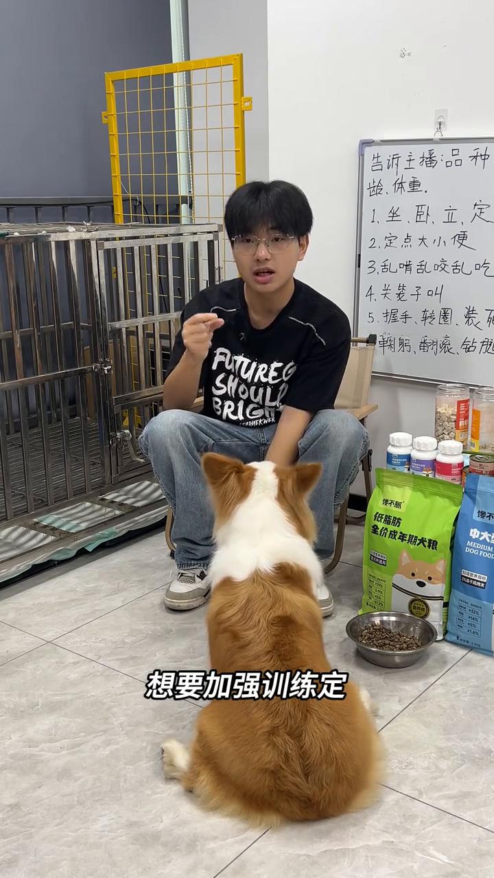 ·学定的话,先让小狗坐,拿一颗狗粮放在这里,说口令定,狗粮在它面前晃,小狗来追就说no,不要让它来追你的手,不追你的手,好狗奖励它。这个是第一步,让它听懂别动的口令。