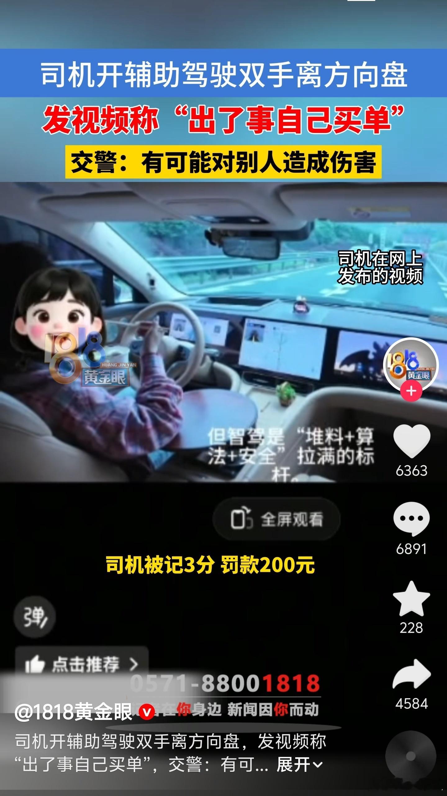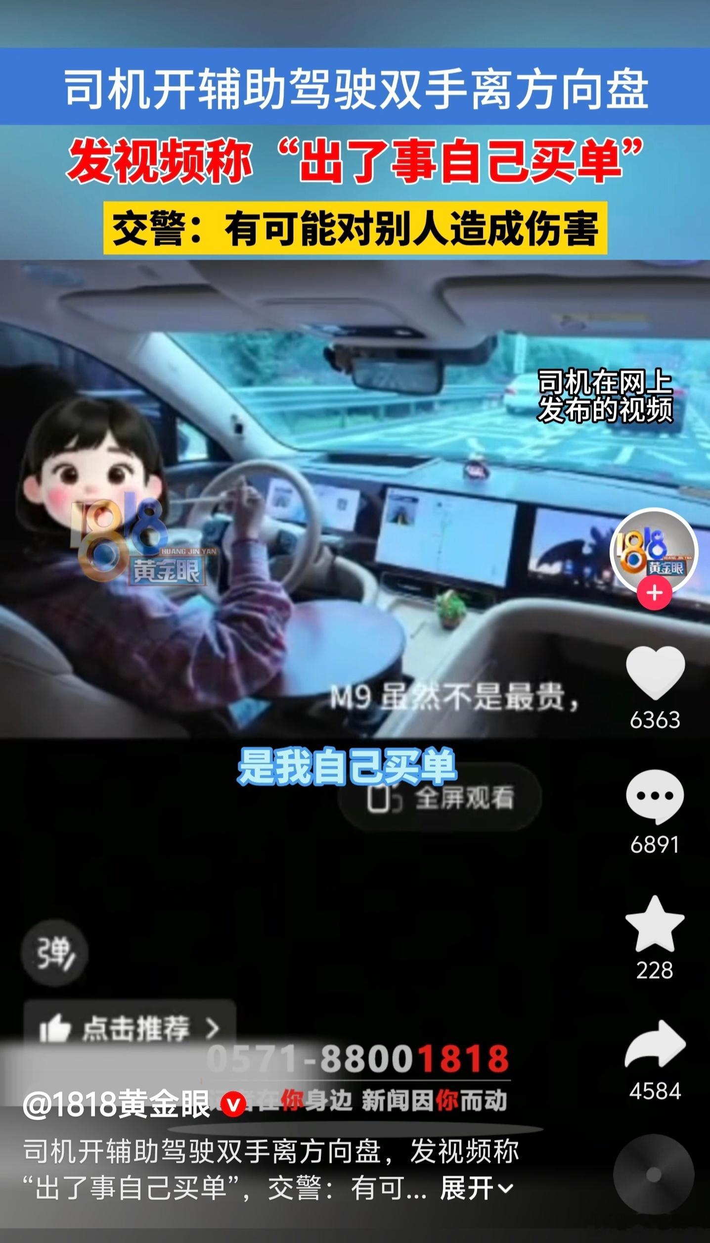 司机开辅助驾驶双手离开方向盘,发视频称出了事自己买单。