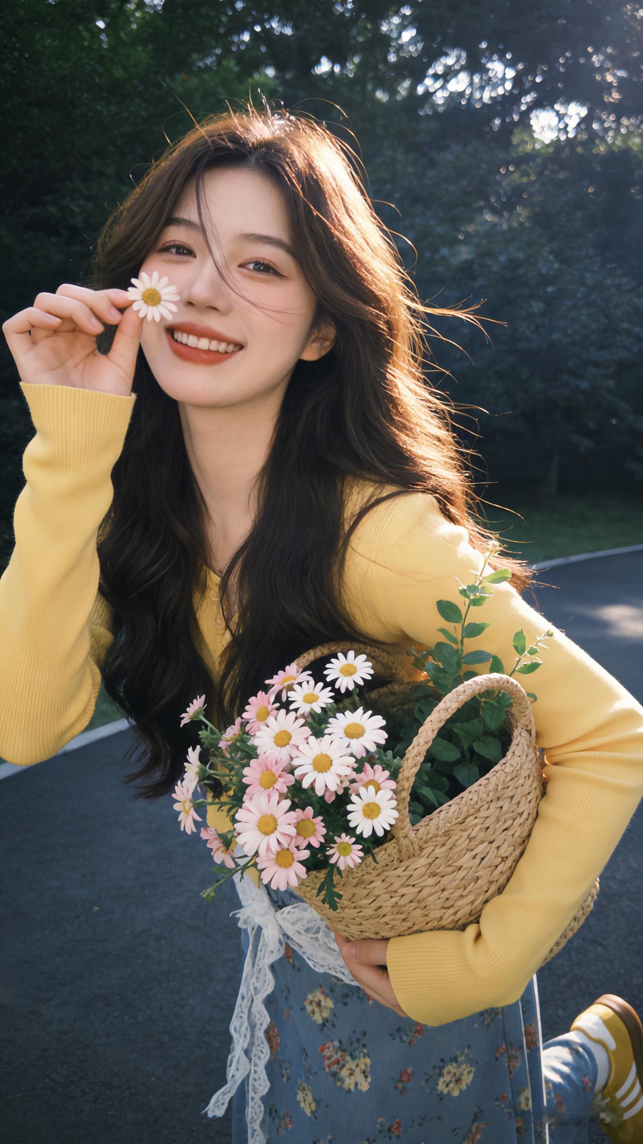阳光下的花束少女,笑靥如花,漫步在林间小道上。