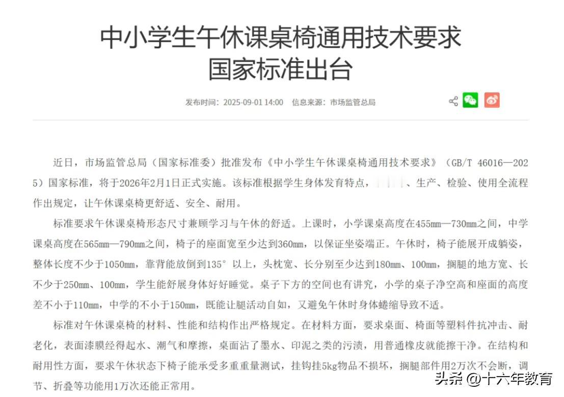 《中小学生午休课桌椅通用技术要求》国家标准,将于2026年2月1日正式实施。标准要求午休课桌椅形态尺寸兼顾学习与午休的舒适。上课时,小学课桌高度在455mm—730mm之间,中学课桌高度在565mm—790mm之间,椅子的座面宽至少达到360mm,以保证坐姿端正。午休时,椅子能展开成躺姿,整体长度不少于1050mm,靠背能放倒到135°以上,头枕宽、长分别至少达到180mm、100mm,搁腿的地方宽、长不少于250mm、100mm,学生能舒展身体好好睡觉。桌子下方的空间也有讲究,小学的桌子净空高和座面的高度差不小于110mm,中学的不小于150mm,既能让腿活动自如,又避免午休时身体蜷缩导致不适。上海身边事