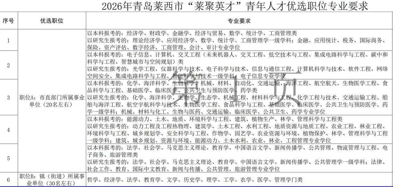2026年青岛莱西市“莱聚英才”青年人才优选公告 1.报名网站: 2.网上报名时间:2026年4月9日9:00—4月17日12:00 3.职位A:市直部门所属事业单位20名左右; 4.职位B:镇(街道)所属事业单位30名左右;