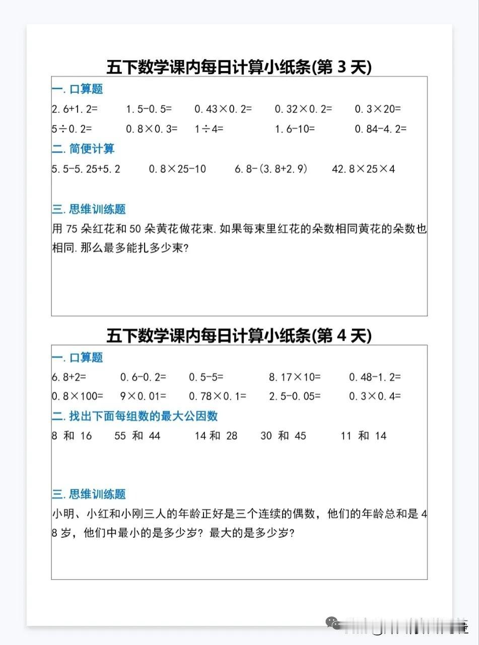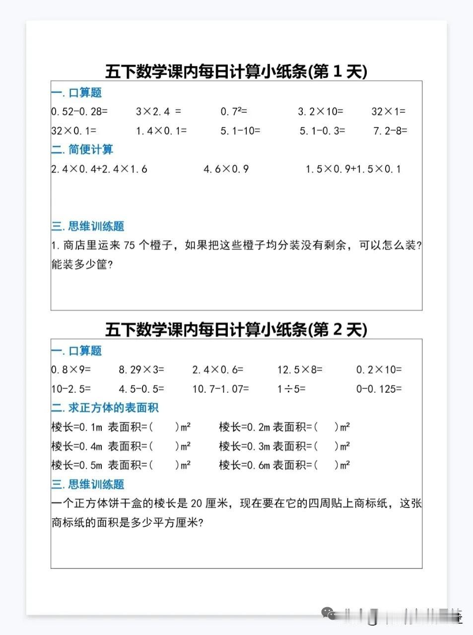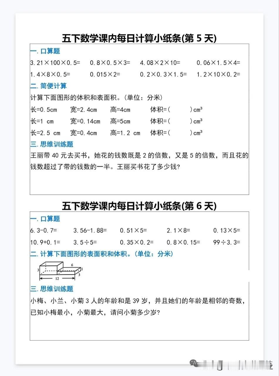 五年级数学 五年级下册数学 小学数学 数学资料 家长收藏 期末复习 人教版数学 小学数学思维 计算小纸条