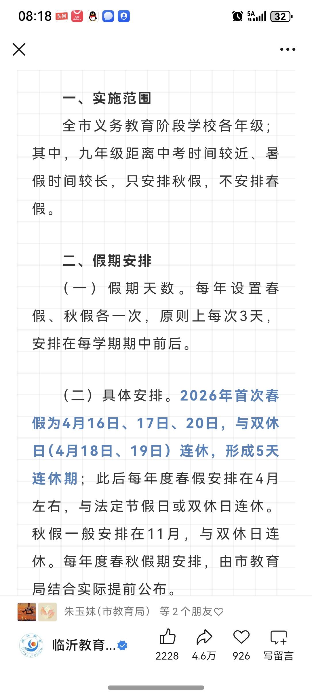 临沂市中小学春秋季具体安排出炉,2026年的春假安排在4月16、4月17,4月20,与双休4月18、19连起来,共5天。其中含着农历三月三、与二十四节气谷雨,有条件的家长,可以与孩子共同度过这个愉快的春假,体验三月三节日的丰富内涵与谷雨的节气特点。
