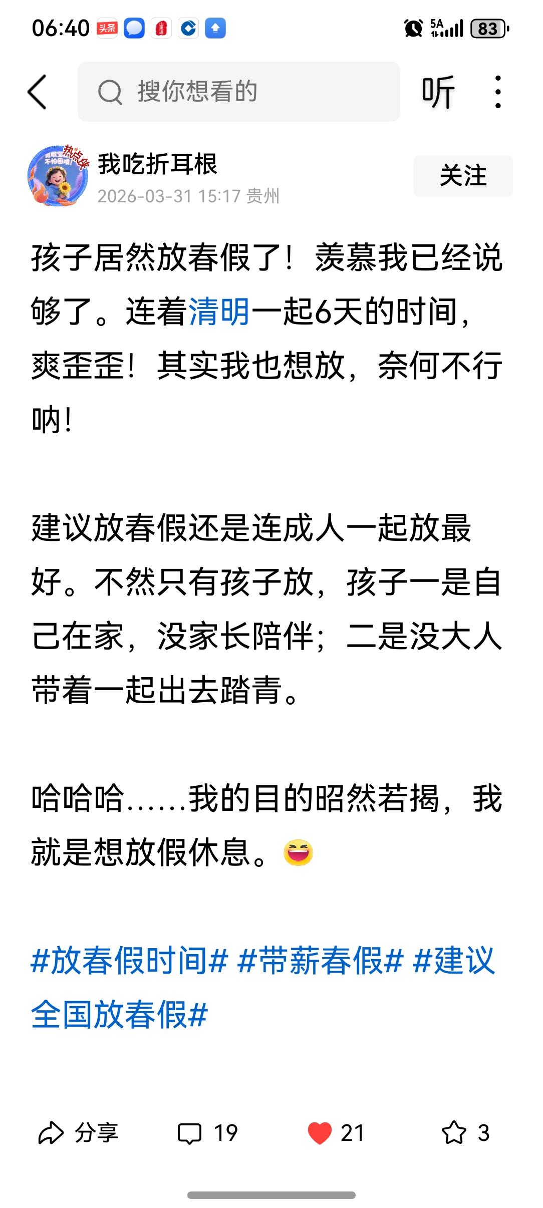 头条上,贵州毕节的学生已接到通知,春假与清明假期放在一起,共6天。