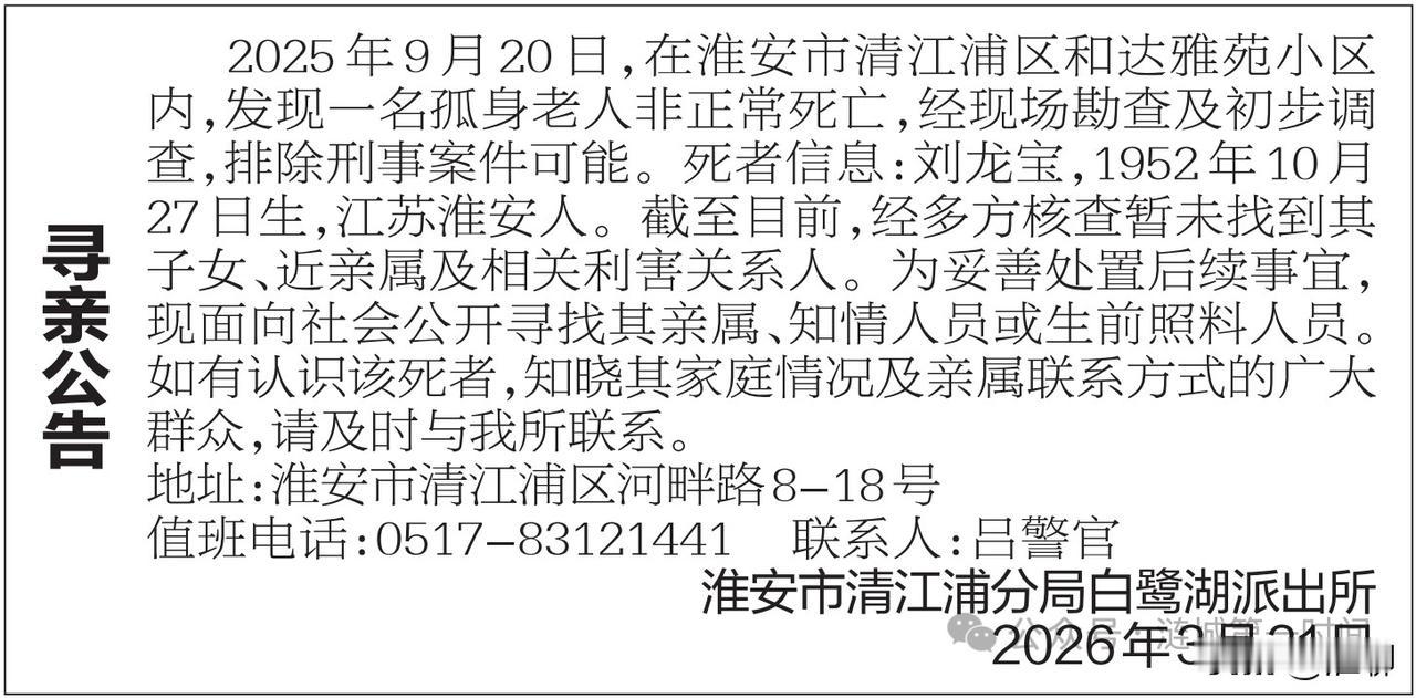 寻亲公告!淮安某小区内一孤身老人非正常死亡...... 来源丨淮海晚报