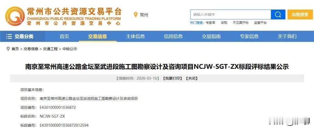 根据江苏省公共资源交易平台2026年2月发布的招标公告,南京至常州高速公路金坛至武进段项目已获江苏省发改委批准建设,项目业主为常州市宁常高速公路有限公司。 2026年3月,该项目施工图勘察设计及咨询中标结果公布,华设设计集团股份有限公司中标NCJW-SGT-SJ标段,中交公路规划设计院有限公司中标NCJW-SGT-ZX标段。 据招标公告披露,该项目路线起自与扬乐高速公路交叉处,向东跨越新孟河,经武进区湟里镇,跨越滆湖后,下穿在建盐泰锡常宜铁路,上跨江宜高速公路,止于与沪常高速公路交叉处,全长约30公里。
