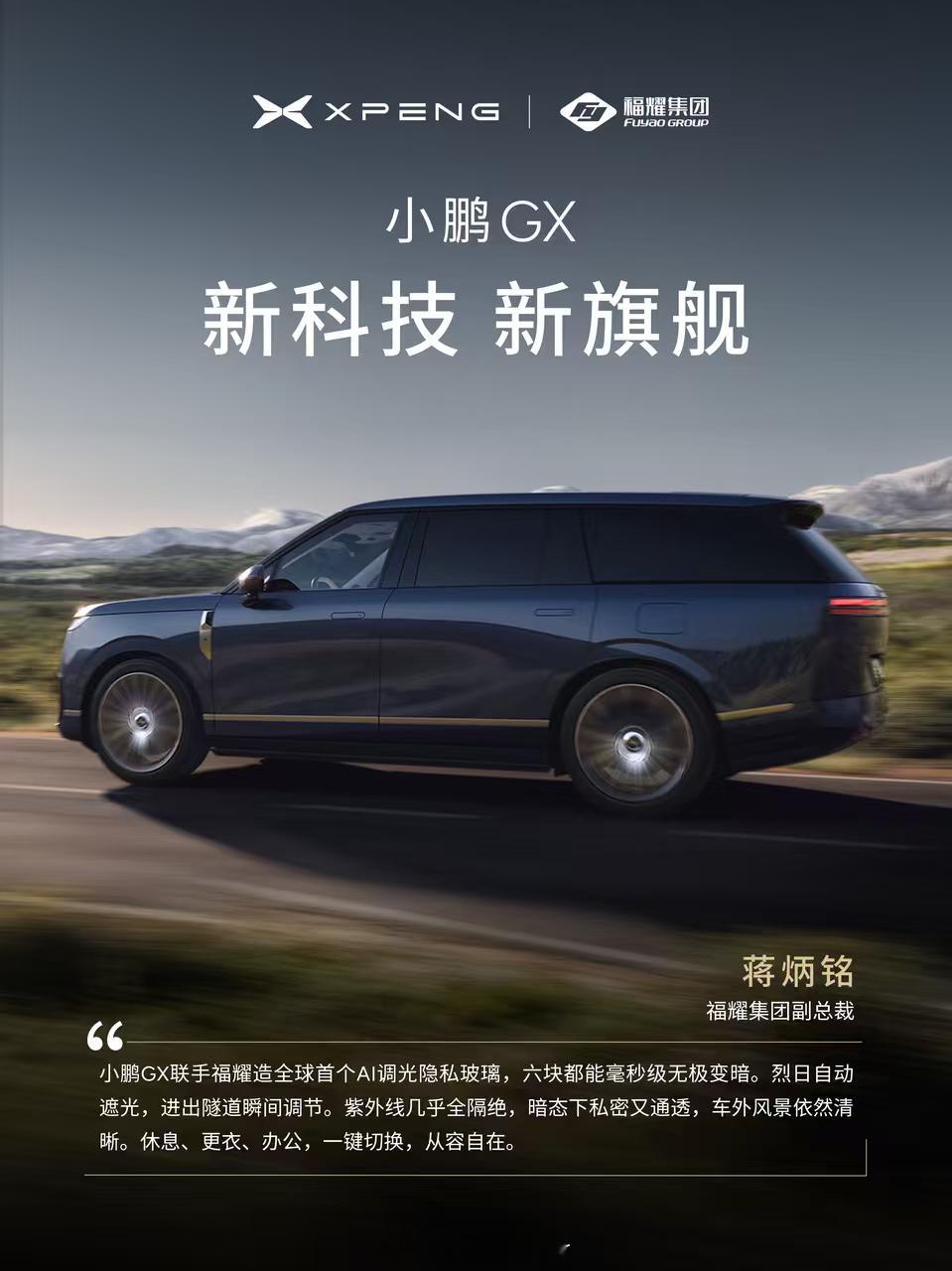 今晚19:00小鹏GX技术发布会正式开启。本次发布会不仅揭晓小鹏GX的硬核技术实力,更集中展示“顶级供应链天团”。小鹏GX全车超90%零部件来自国内外头部供应商,包括博世华域最新一代线控转向,福耀首个AI调光隐私玻璃、华为乾崑AI投影大灯等关键部件。今天这些顶尖供应商的高管集体发声,为小鹏GX实力站台。强强联手,共同打造这款新科技旗舰SUV。全球顶级供应链集体点赞小鹏GX新科技旗舰小鹏GX今晚预售