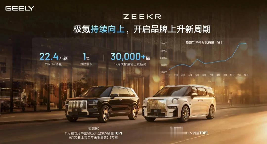 事实上,极氪这个平均售价超过30万元的品牌目标从设立之初就是高端对象,从001到9X都在讲科技讲豪华,典型的先立品牌再做销量。这个策略也并不一帆风顺,直到极氪9X的出现:上市四个多月累计交付超3万台,2025年12月单月交付破万。