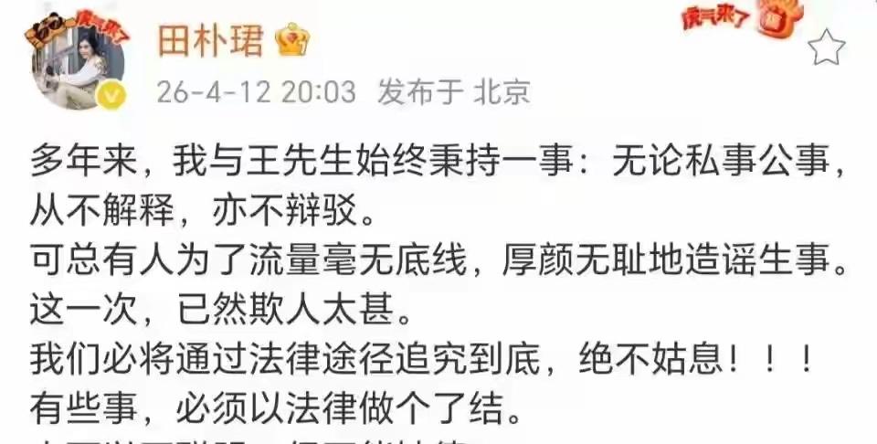 她先是放狠话:多年来从不解释不辩驳,但这次造谣者为了流量毫无底线,欺人太甚!明确表态必将通过法律途径追究到底,绝不姑息。随后又力挺王石,直言他是有底线、守原则的人,多年商界口碑就是最坚实的底气,坚信法律会还人清白。最后还分享了女儿的暖心画作,用家人的温柔抚平所有不快。