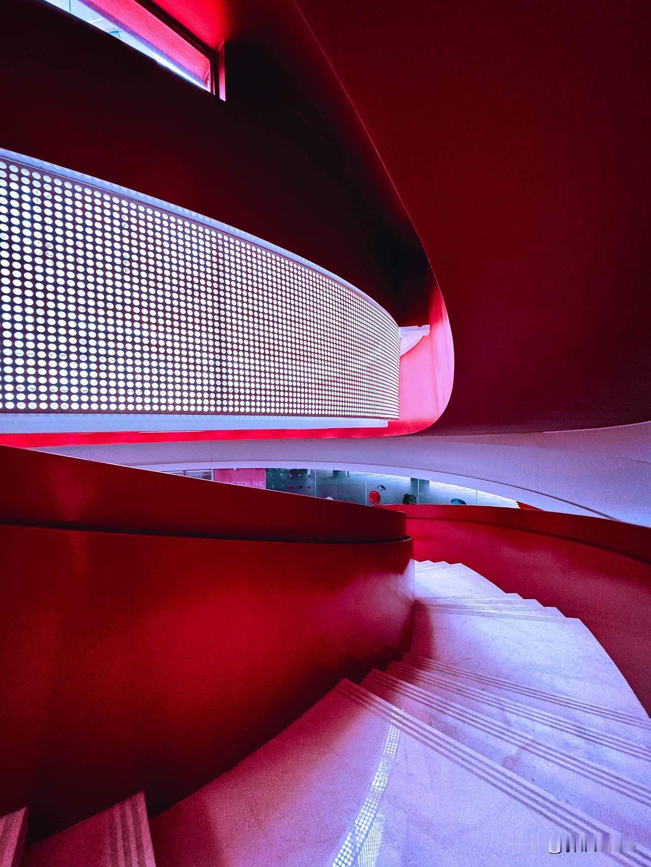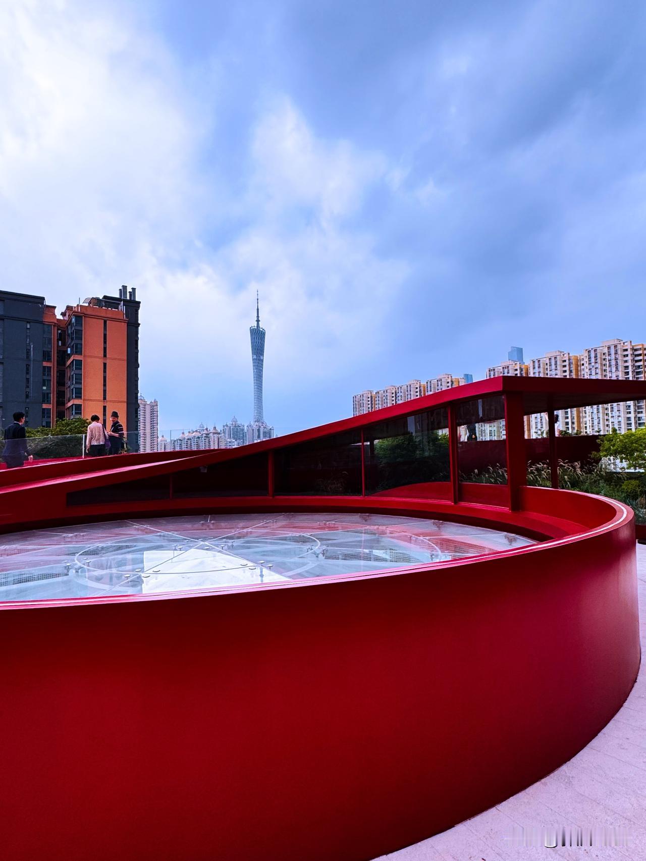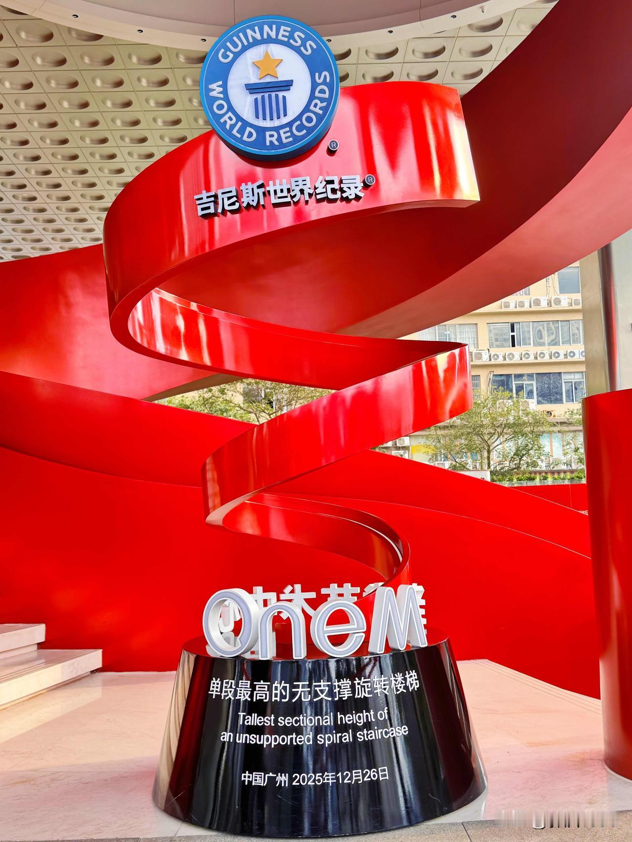 『OneM当代艺术中心』是其内部一座贯穿多层无支撑旋转楼梯的单段最大高度吉尼斯世界纪录认证。该中心以“珠江之舞”为设计理念,建筑外观通过四个堆叠扭转的体块塑造出舞者回望广州塔的姿态,以最大8米的无支撑悬挑,形态如红色绸带。其名字念作“One More”,寓意“比一更多”。其“空中红梯”与对岸的广州塔遥相呼应,形成“一塔一梯”的珠江对话景象。(2026.3.26)