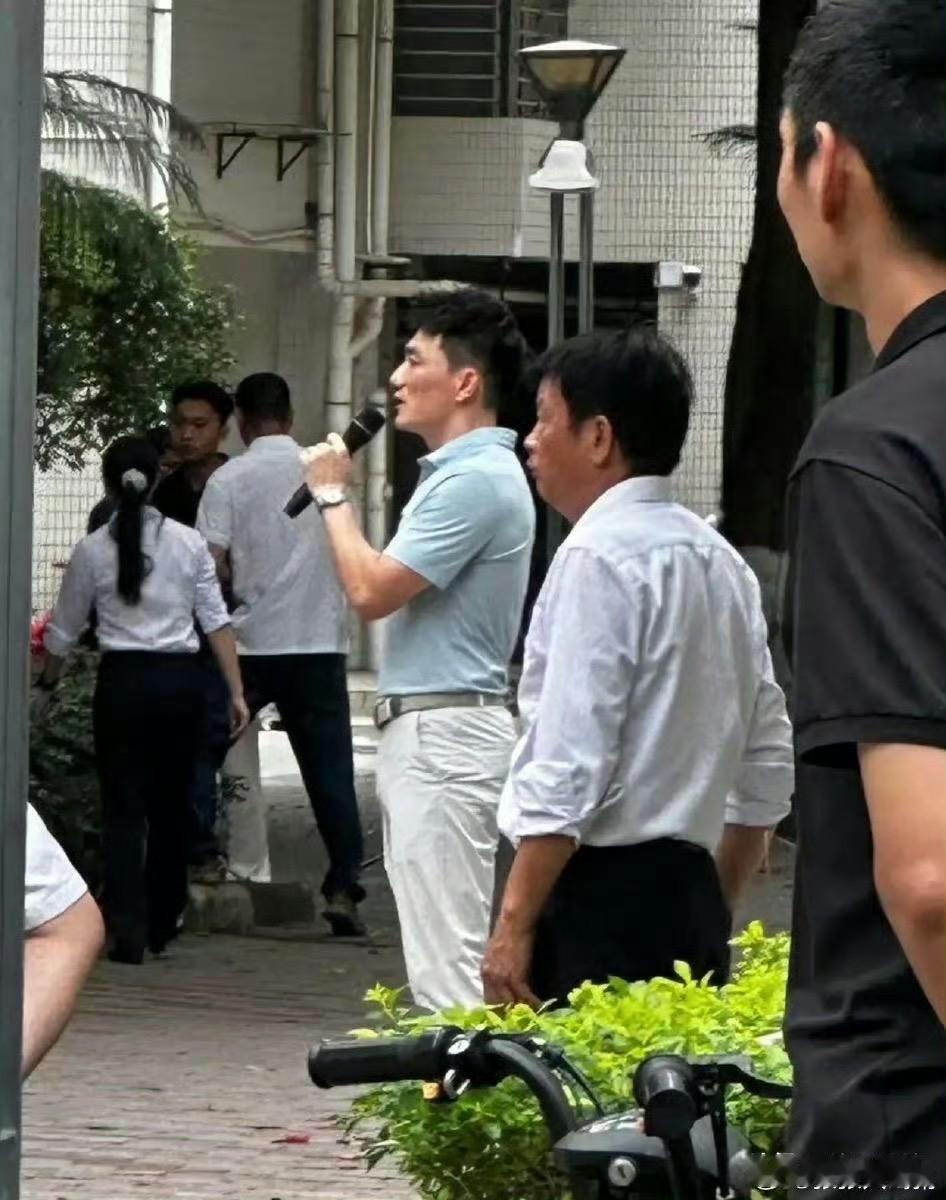 他一身腱子肉,高大帅气让人挪不开眼,他正在给保安培训消防演习,别人都有大肚腩,何捷有胸肌腹肌,站在同事们身边很出彩。