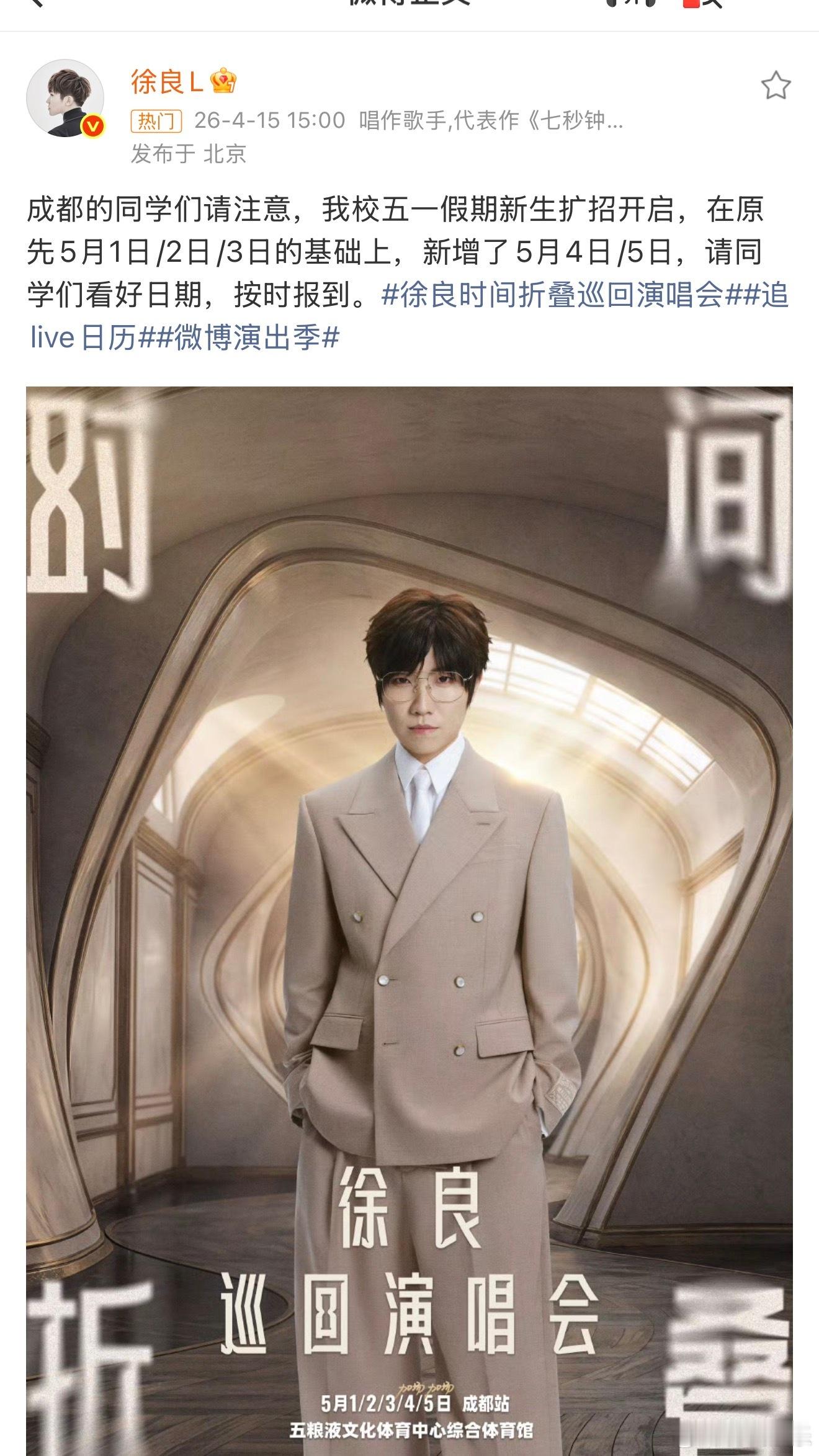 徐良成都演唱会加场 今天,发文:成都的同学们请注意,我校五一假期新生扩招开启,在
