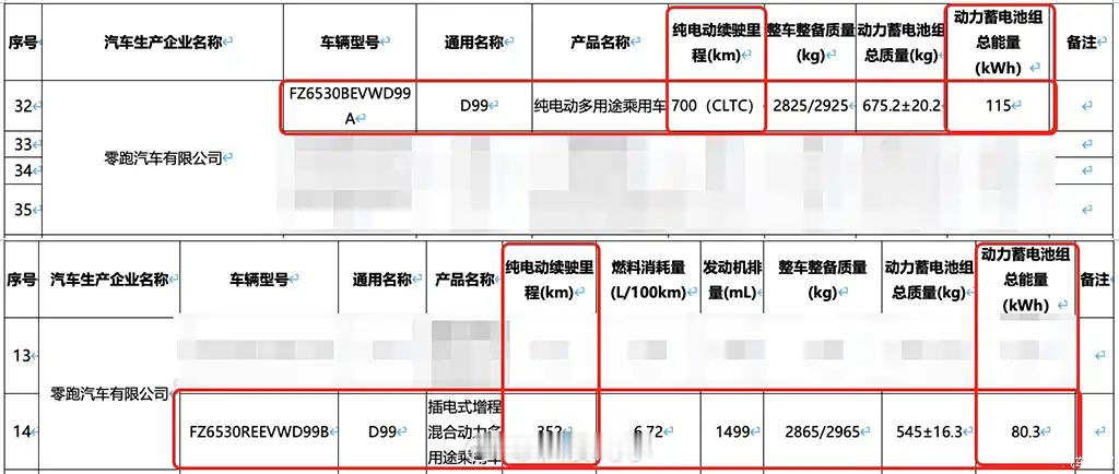 零跑D99车型申报信息曝光纯电车型,115kWh电池包,CLTC纯电续航700km增程车型,80.3kWh电池包,WLTC纯电续航352km