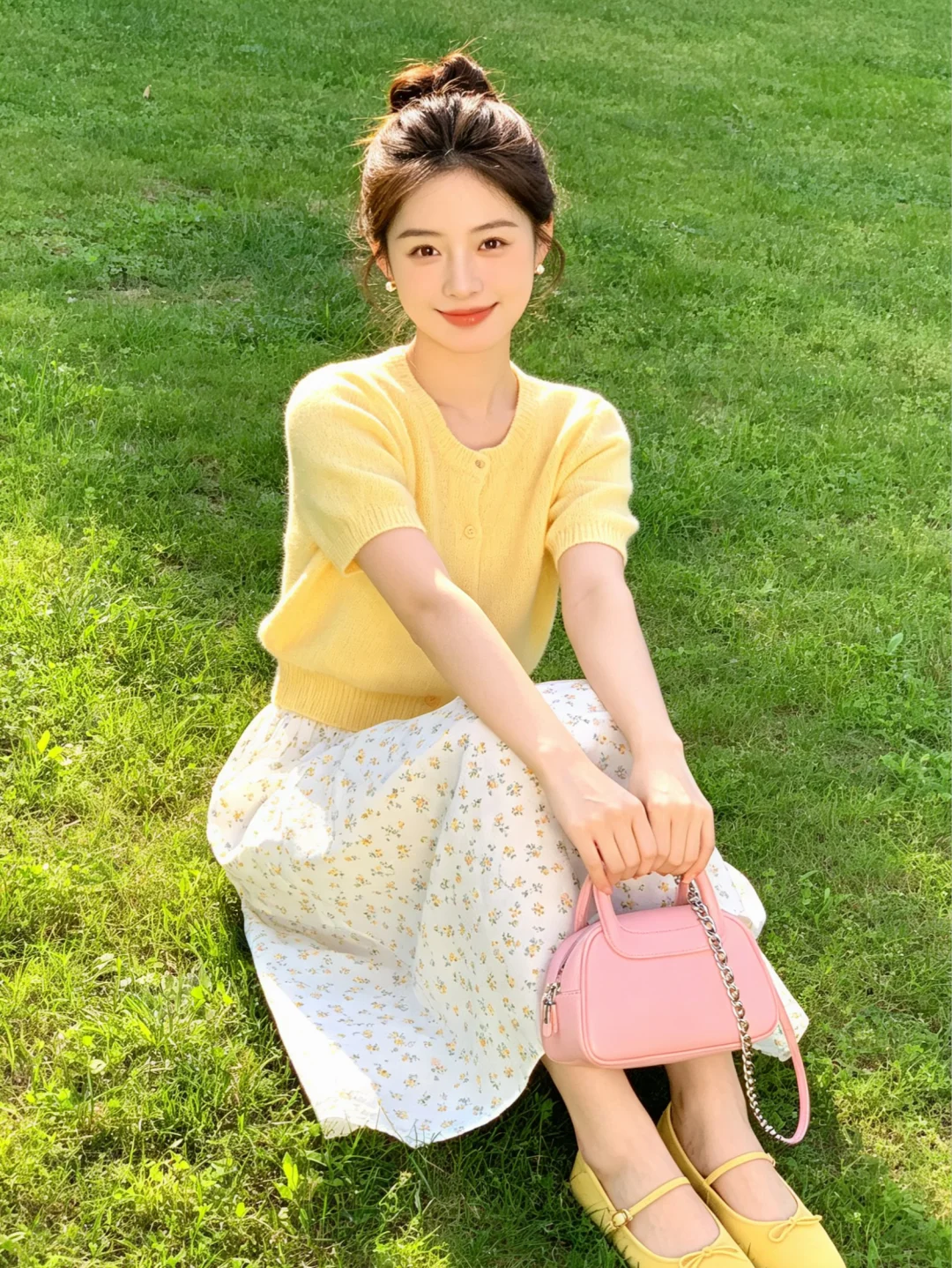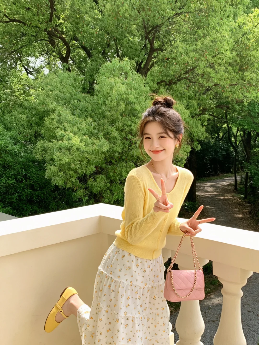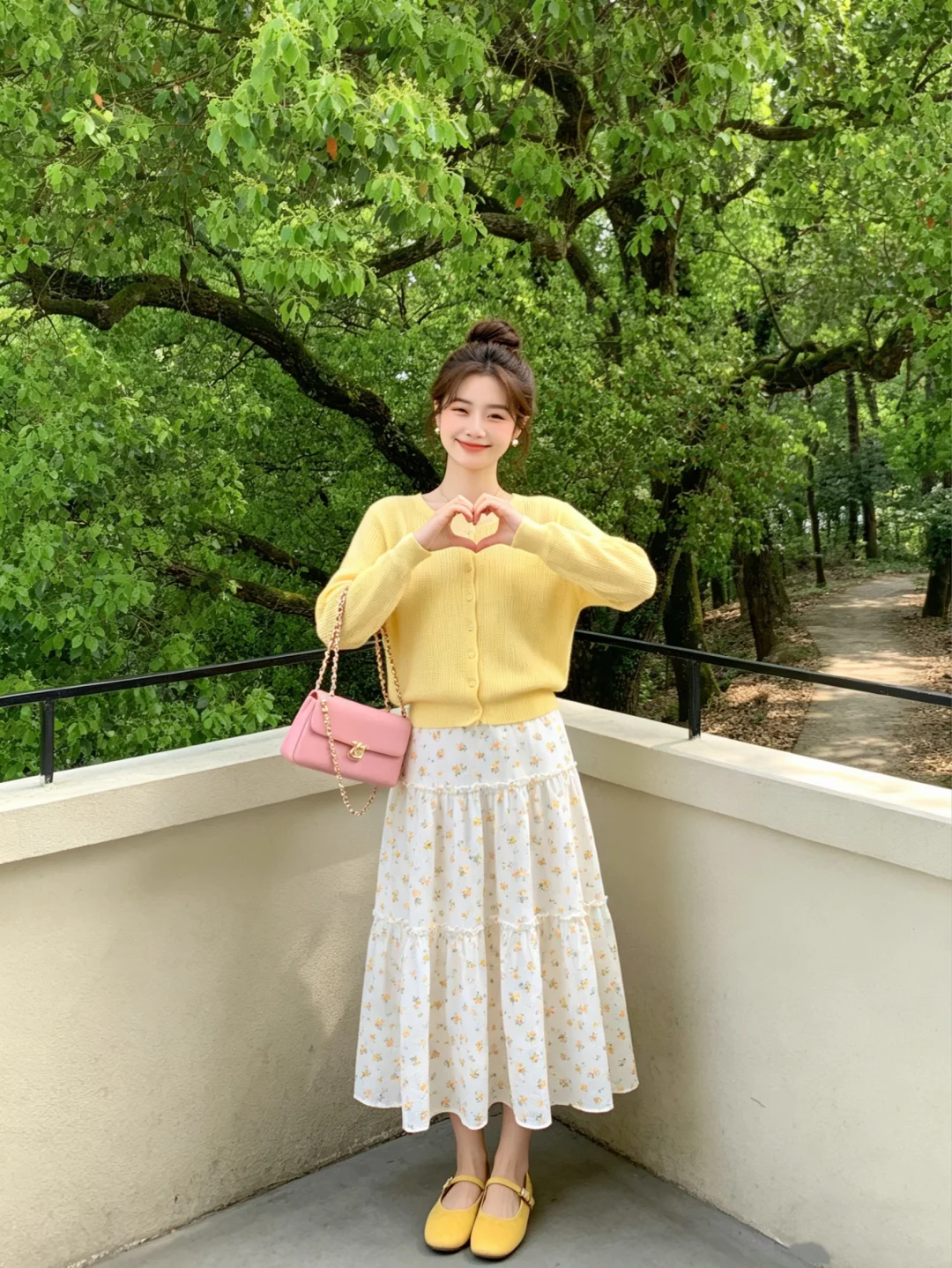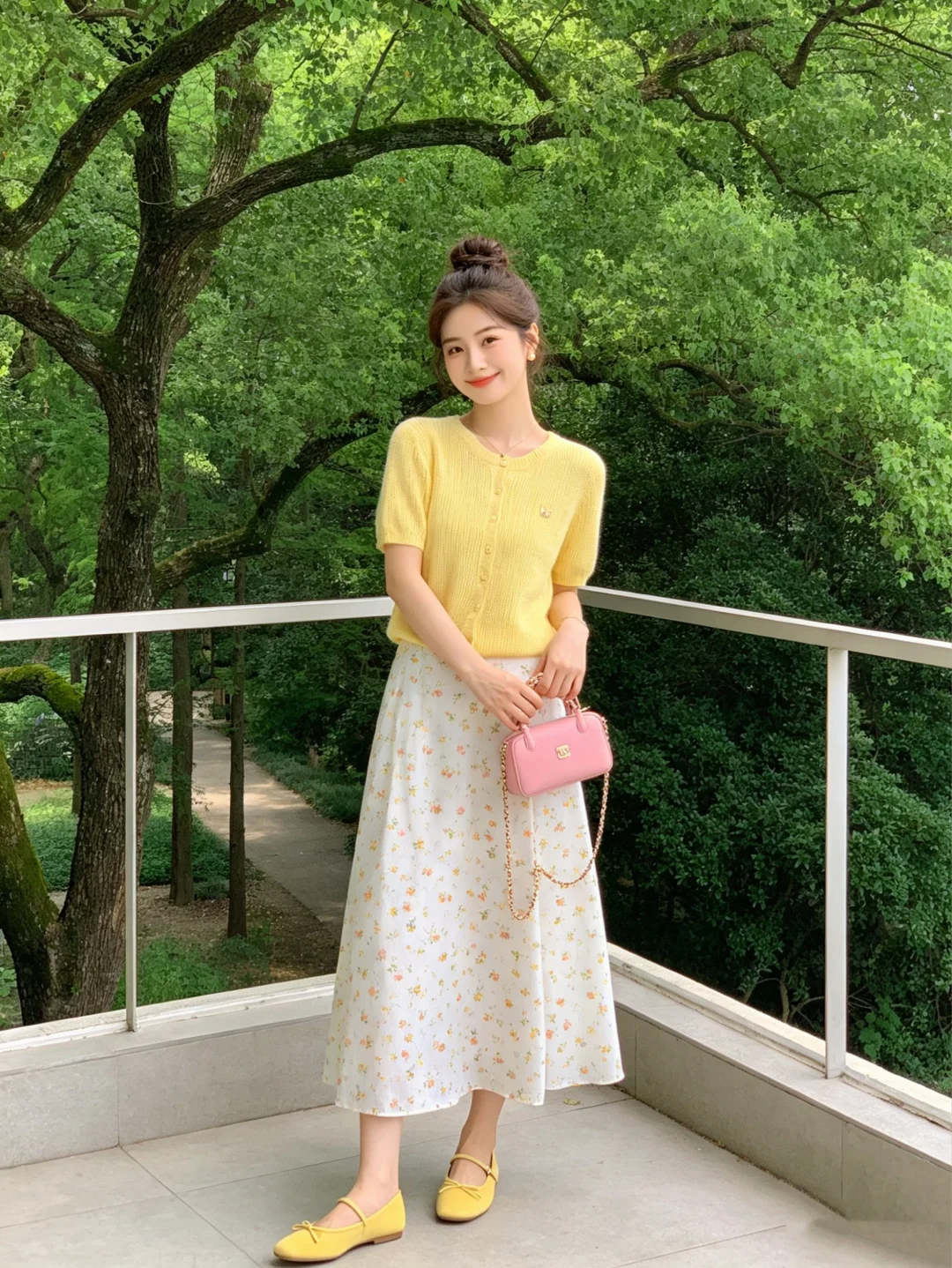 碎花裙搭配 温柔穿搭风 碎花裙 小碎花长裙 短袖T恤 针织短袖 鹅黄色 赏花穿什么 无碎花不春天 把花花穿身上