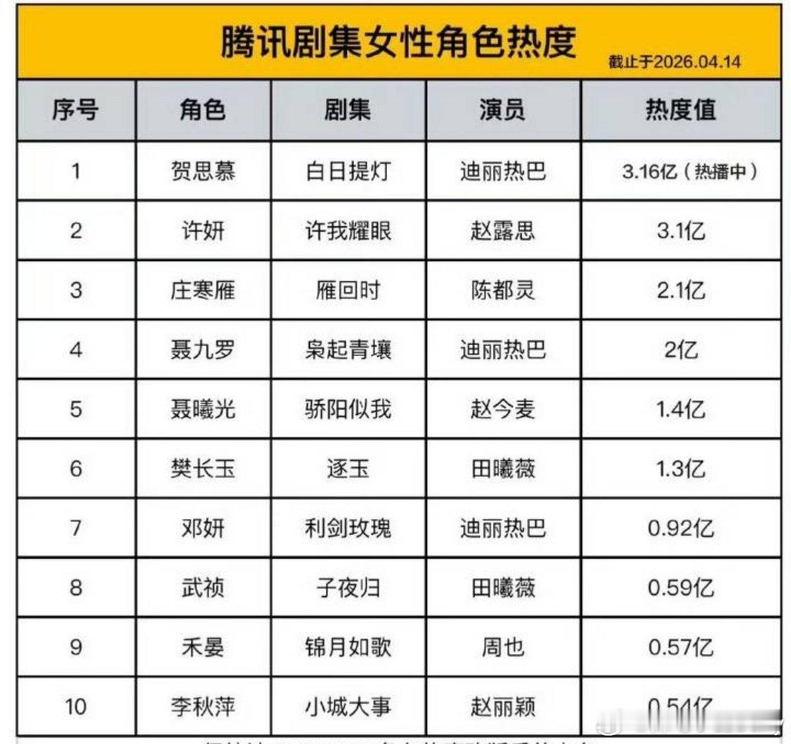 两个版本的🐧剧集女性角色热度排名榜,第一个版本杨紫小夭12e断层第一,第二个迪丽热巴贺思慕3.16e排第一,哪一个才是官方发出来的?