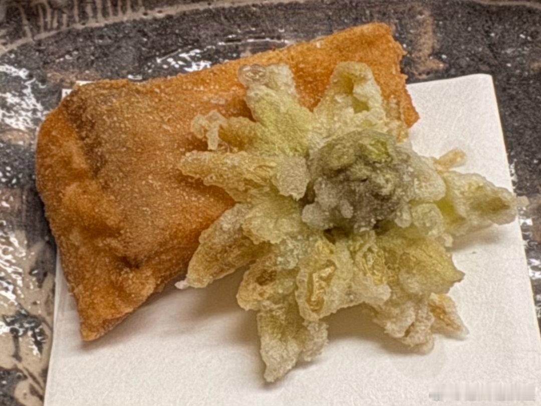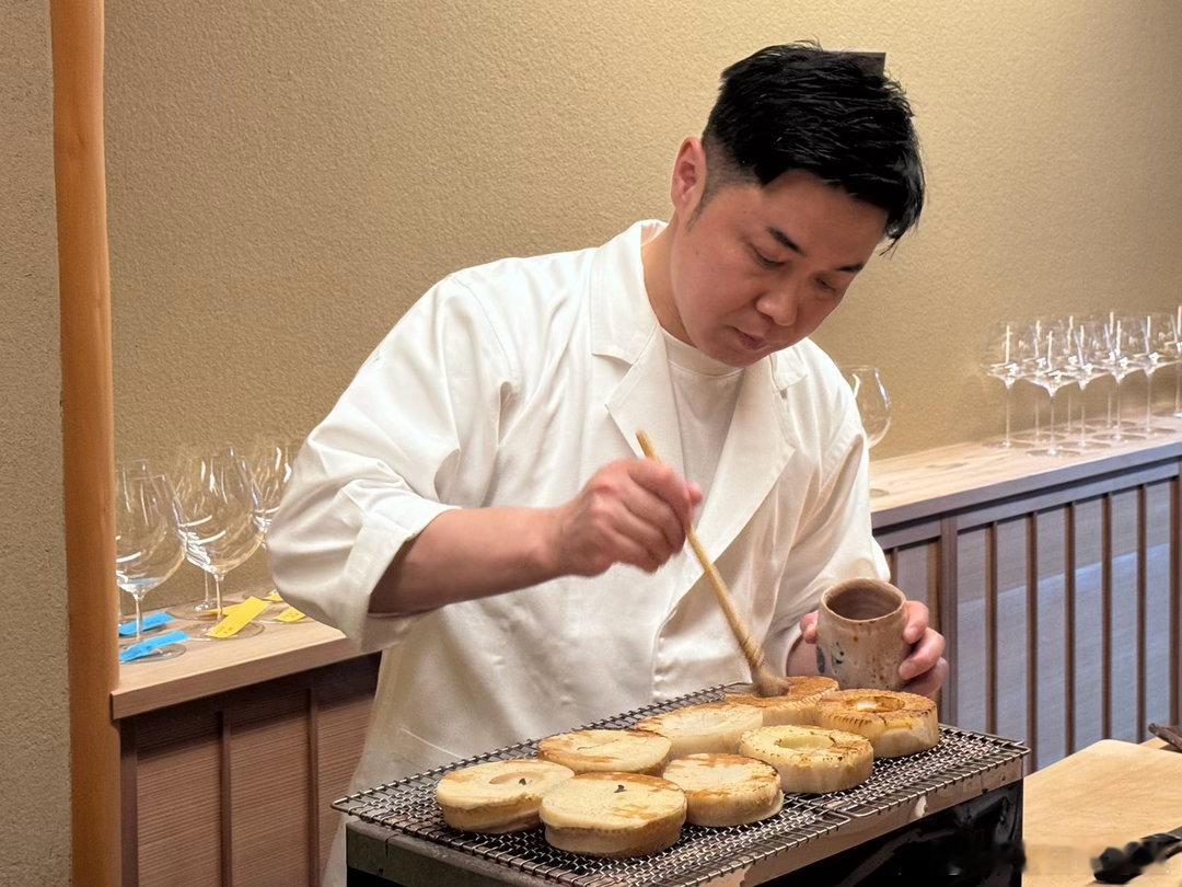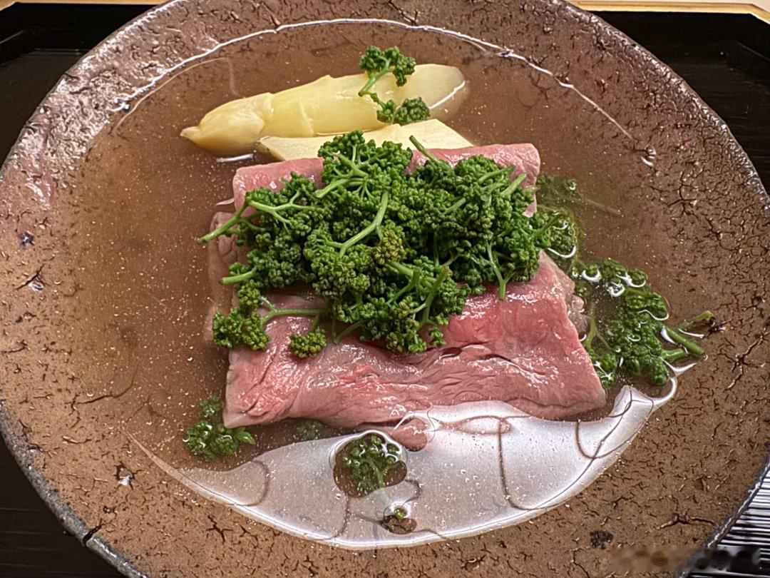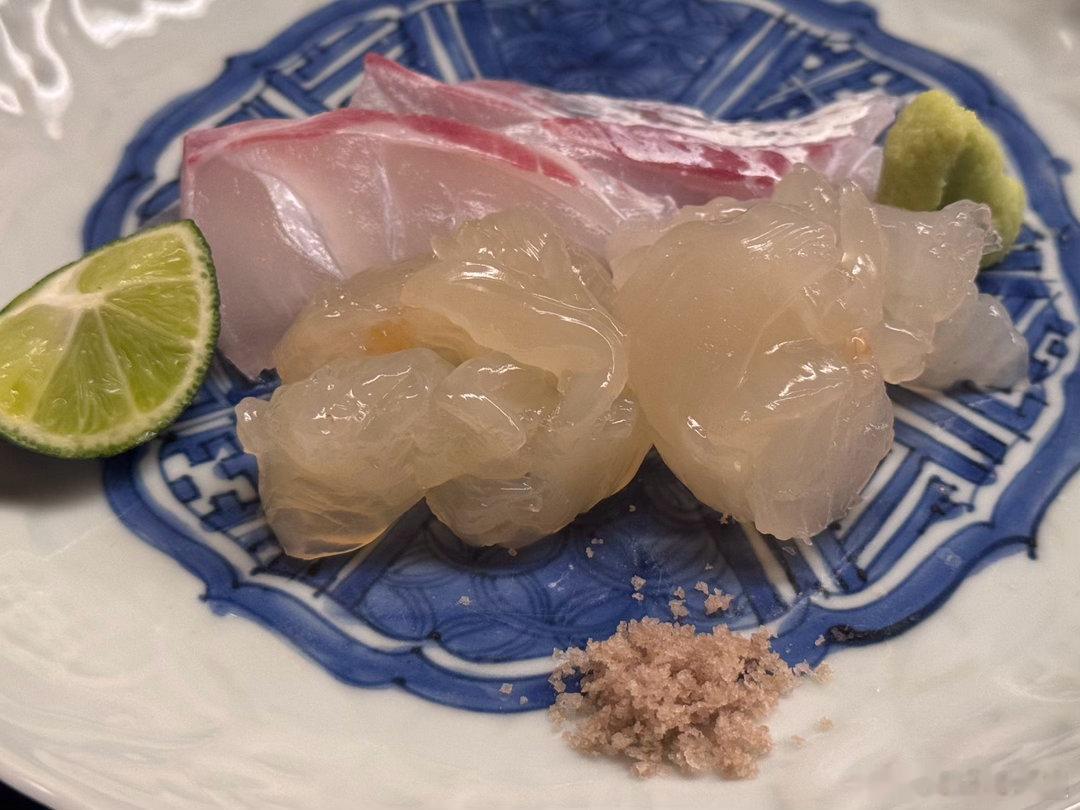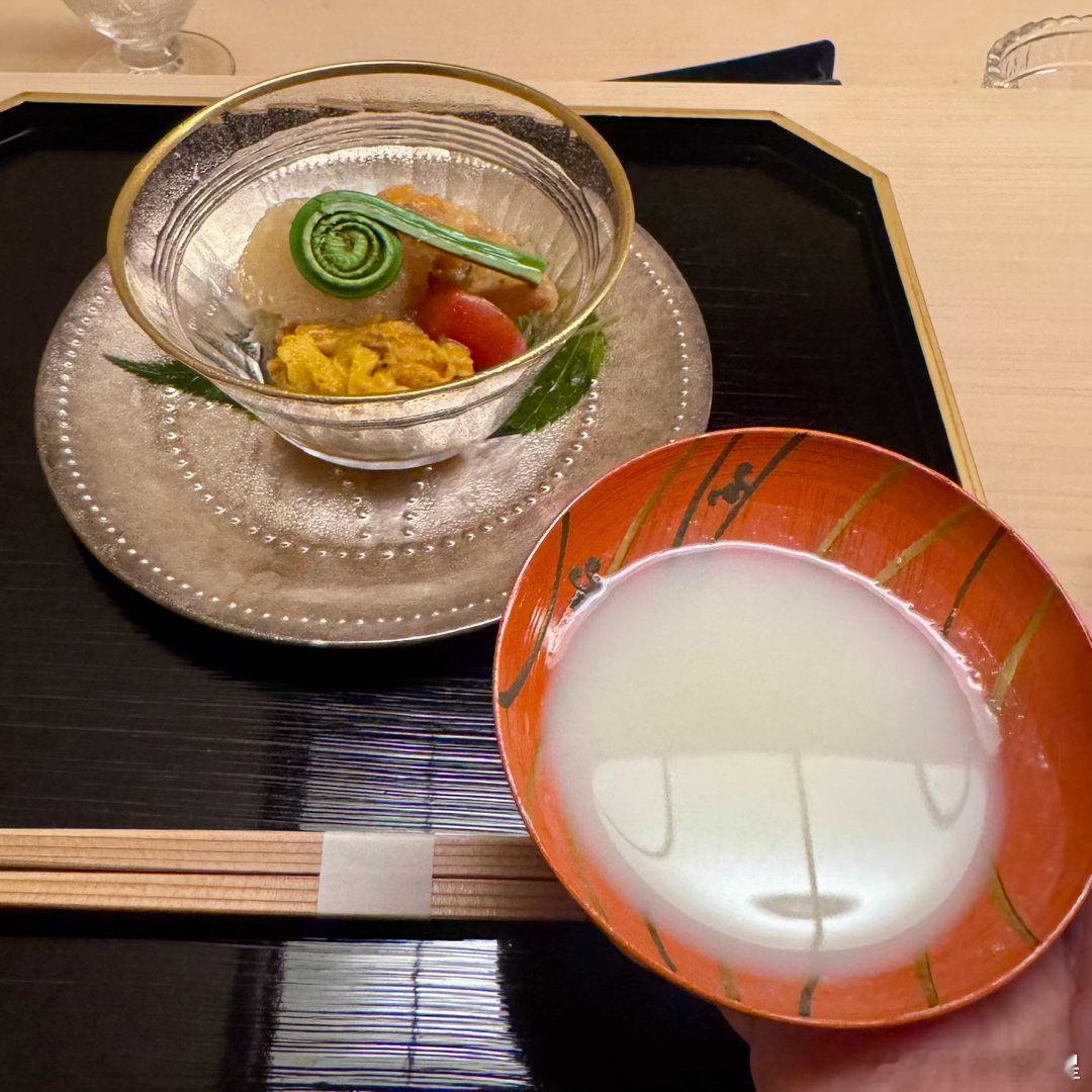 说菜。图1是雪蟹的蟹黄、啫喱、肉泥,还有淡路岛的紫海胆,配他家自酿的酸奶酒,鲜美,酸奶酒好喝。图2是白甘鲷的手卷,淡鲜美味,这是我吃过的最高等级的鲷鱼,非常赞叹。图3是京都白子笋和淡路岛软糯鲍鱼的椀物、这种高级的白子笋在市场上是买不到的,有奶香味。大阪能买到一万日元一颗的白子笋,和这个差很远。图4的刺身是明石鲷鱼和淡路岛的伊势龙虾,龙虾太鲜美了,乃至于有爽脆感,目前为止吃过的品质最好的龙虾刺身。图6是山花椒皇带鱼,很鲜美,现在正是山花椒的季节。山花椒分公母,通常是公山花椒比母山花椒更高级,但是最顶级的反而是母山花椒,道人用的就是最顶级的。图7是母山花椒和白子笋做的和牛呷哺,滋味鲜美。然后是主菜,图5的烤大白子笋,太赞了,口感似菠萝,笋吃到这个地步算是到头了。图8是樱鳟和蜂斗菜的天妇罗,图9是刺嫩芽的天妇罗,口感不错。图10是豆腐皮包青干薇,淡雅鲜美,好吃。接下来的饭物首先是吃一口白米饭,然后是主食,白子笋饭配鰆鱼(图10-11),图12是山口的虎魨,这个季节还能吃到炸虎魨真是难得。接下来的米饭是鸡蛋鲣鱼片盖饭。图15的甜品是樱花麻薯,里面是豆沙和糯米,樱花叶子也能吃。茶怀石的结尾是一碗抹茶。图17是喝的酒,也是价格担当。