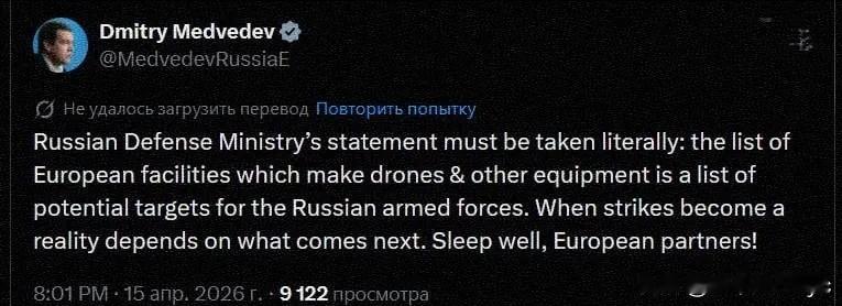 俄罗斯国防部于4月15日公布了为乌克兰生产无人机及零部件的欧洲企业清单,随后联邦安全会议副主席梅德韦杰夫在社交媒体上以强硬措辞进行背书,将这份“清单”直接等同于俄军的“潜在打击目标清单”。这标志着俄罗斯对西方援助的回应策略出现了显著升级。