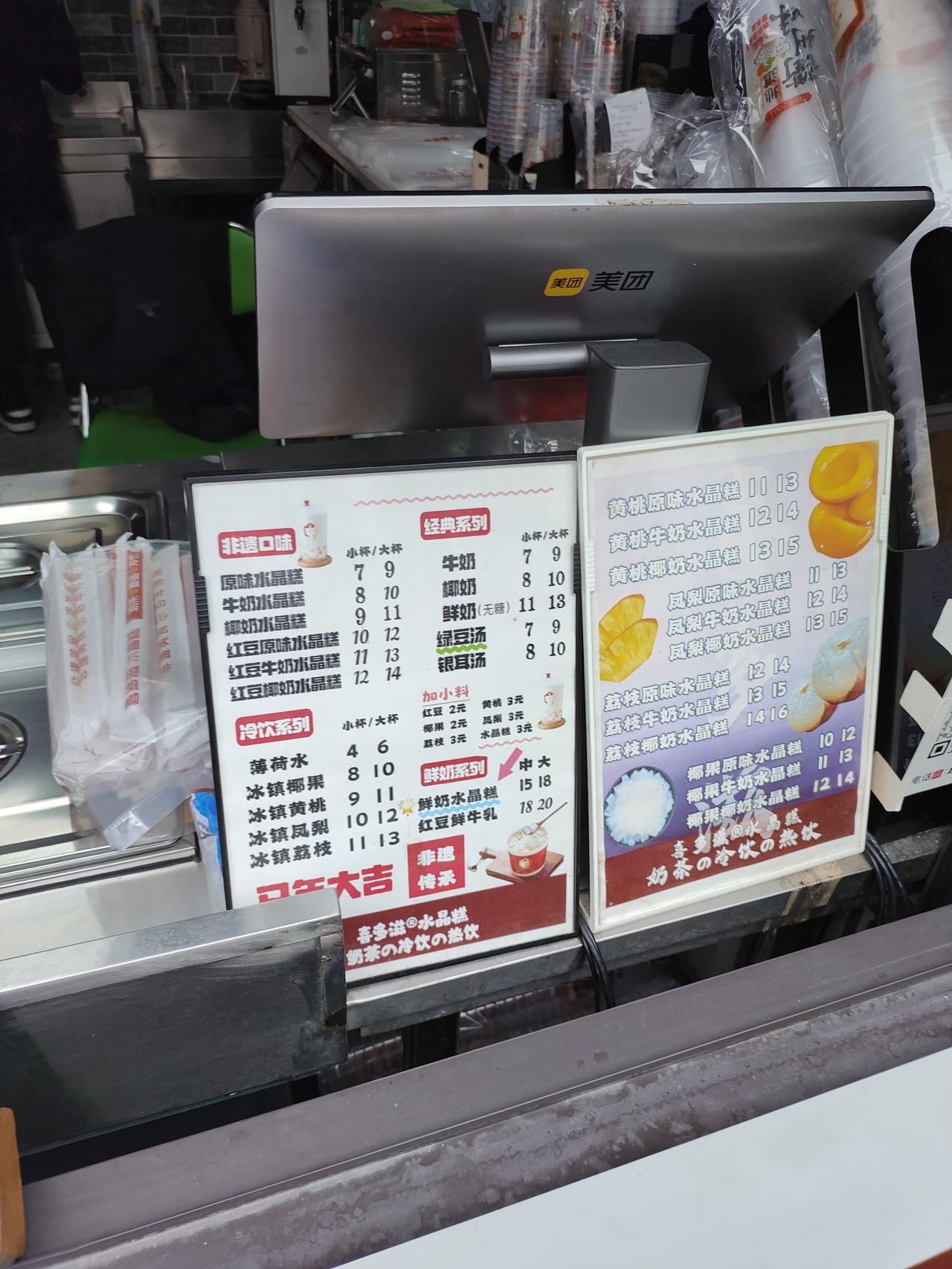 去坐高铁时很明智的打包了一杯牛奶红豆水晶糕,正好打发了坐车前的无聊时间,水晶糕软软糯糯,里面有蜜一样的红豆,牛奶味不浓,冰冰凉,喝着很舒服。原来他店里有鲜奶水晶糕,价格稍微贵一点,这还是有区别的,作为本地特色饮品必须要尝一尝!水晶糕 美食推荐