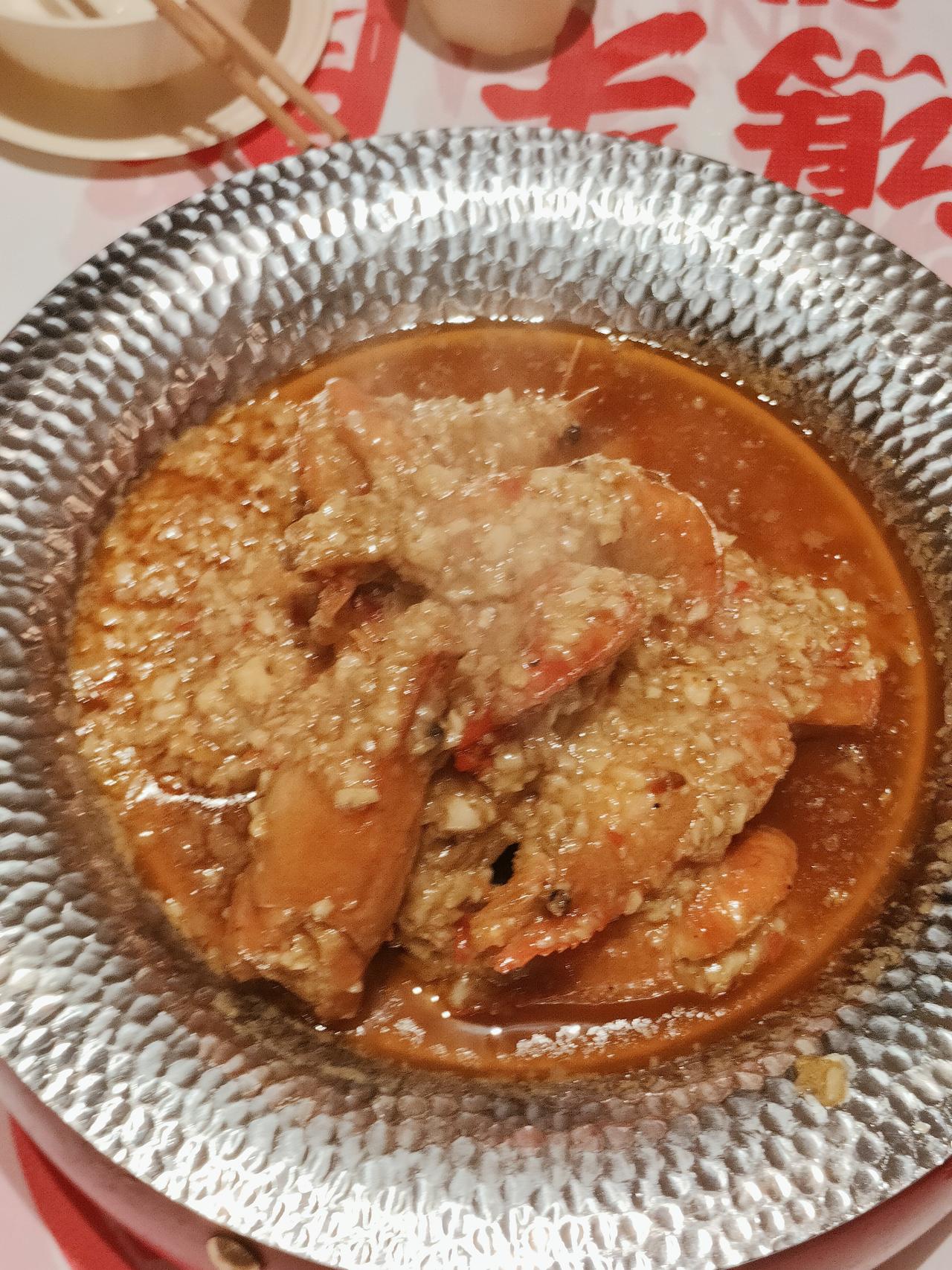 离市区确实是有点远,但是特地奔过来一趟还是挺值得的。这家店里面有很多明星曾经光顾过,墙上贴着很多老板跟明星的合影。烧烤确实是好吃,兰花干子炸的非常酥脆,超大一块,罗氏虾的个头非常大,而且蒜蓉也是相当入味的,这个蒜蓉酱调得非常好。烤肉的肉串很香,烤五花肉肥瘦相间,鸡肉也很嫩,辣度是中辣。甜品陈皮红豆沙真的熬得好好啊!