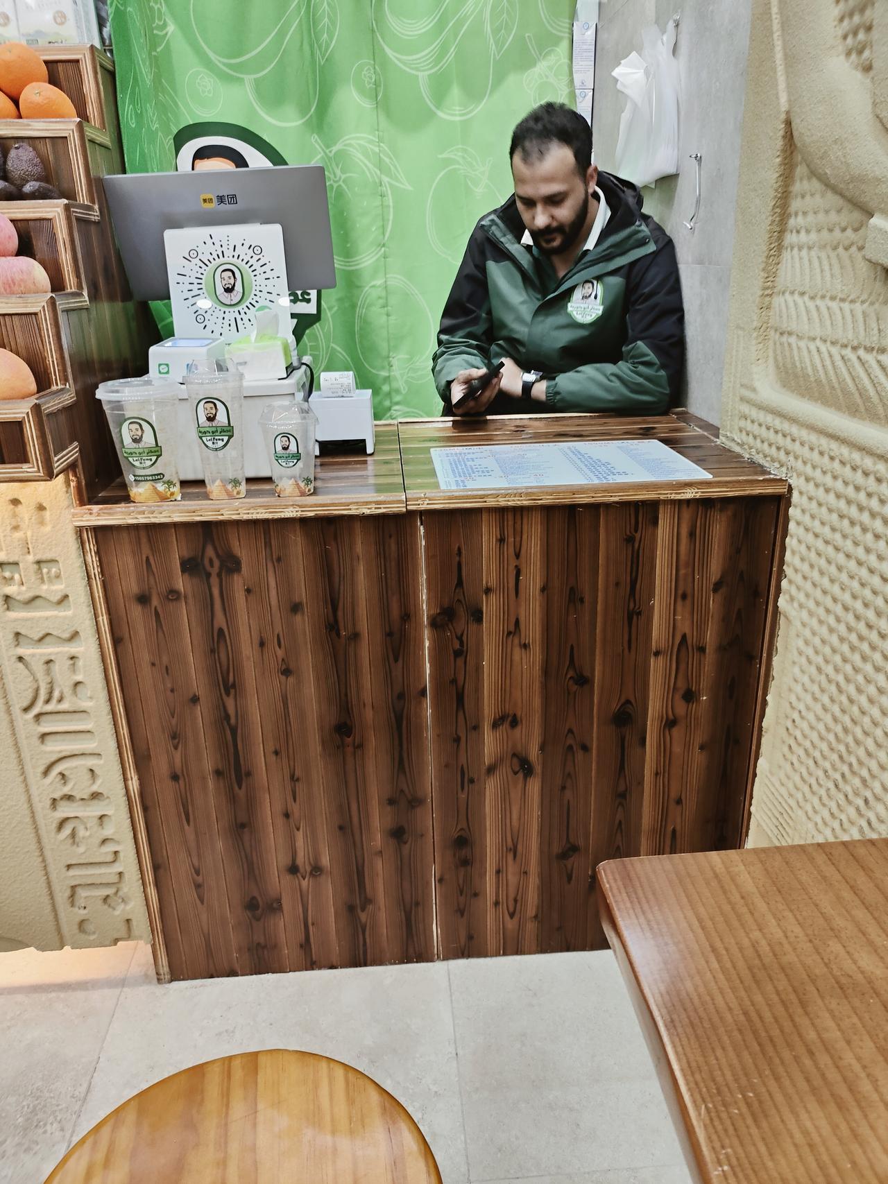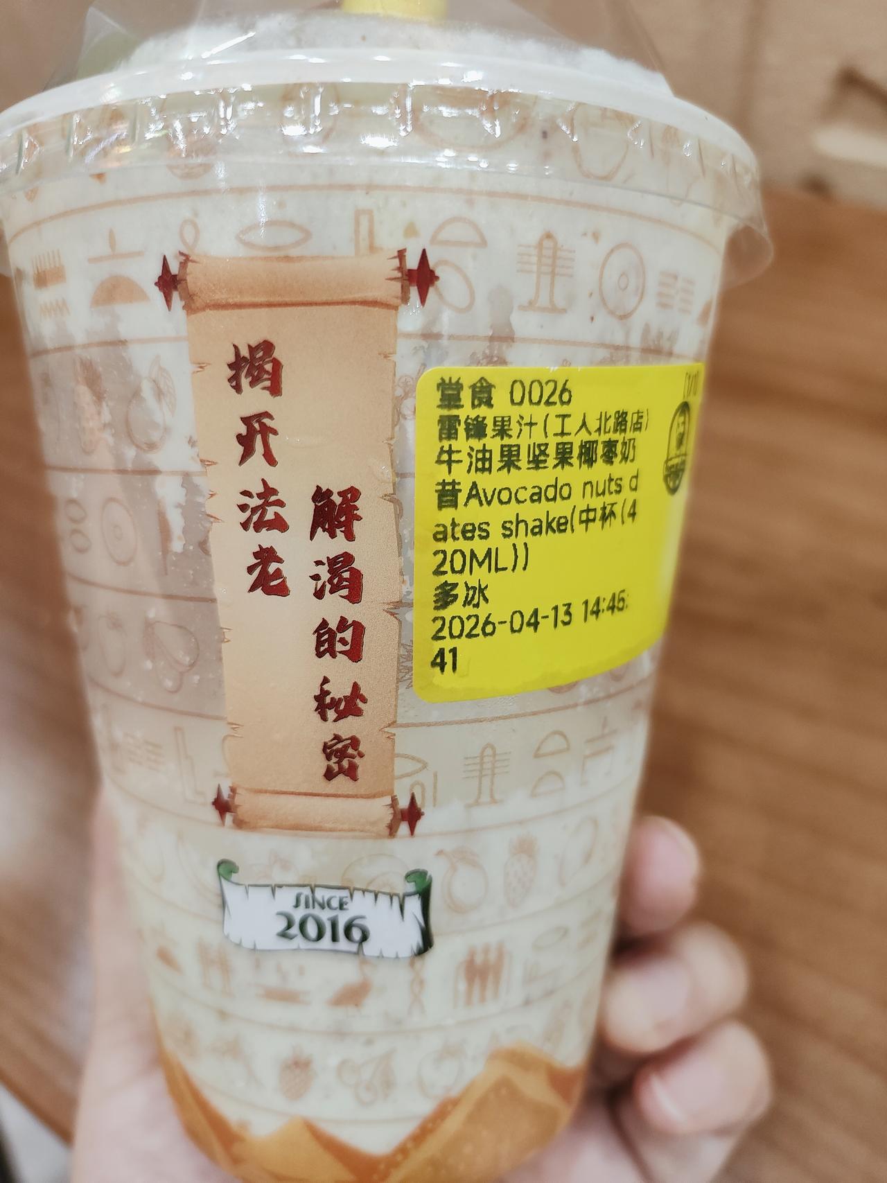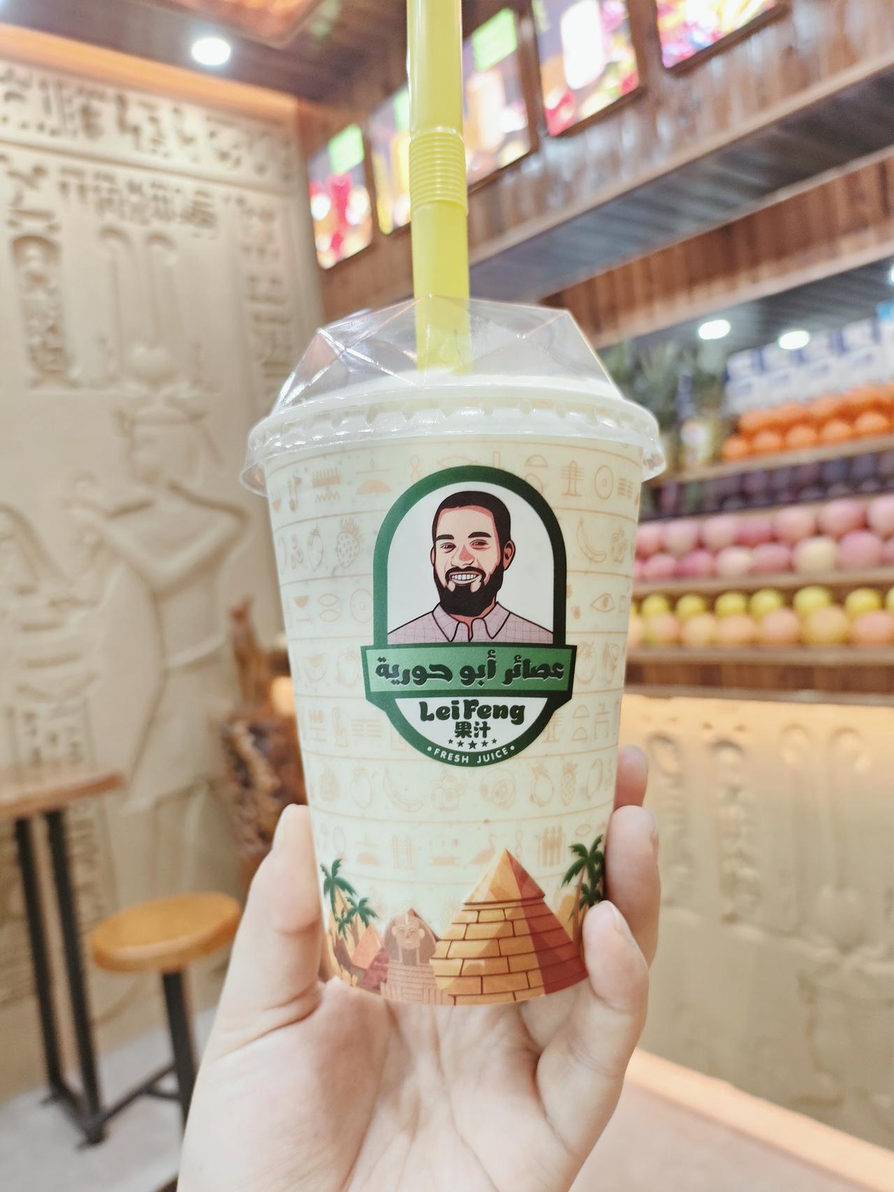 来都来了,还是要试试这杯雷锋果汁,老板正好在店里,他普通话挺标准的,点了一杯牛油果坚果椰枣奶昔,感觉没有加多少冰,非常浓稠,可以把杯子倒过来,里面有坚果碎椰枣香,甜度刚好,味道挺好的,口感很天然。店里是埃及法老风,装修挺有意思的!网红饮料 义乌美食