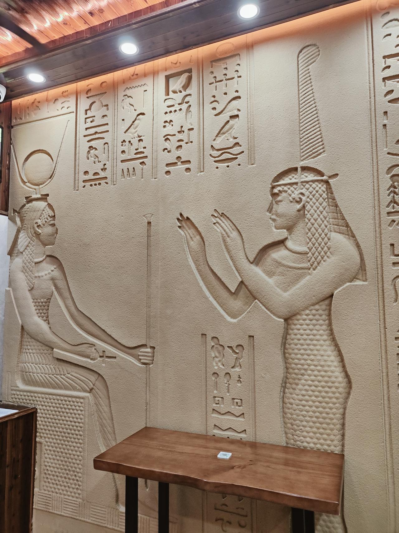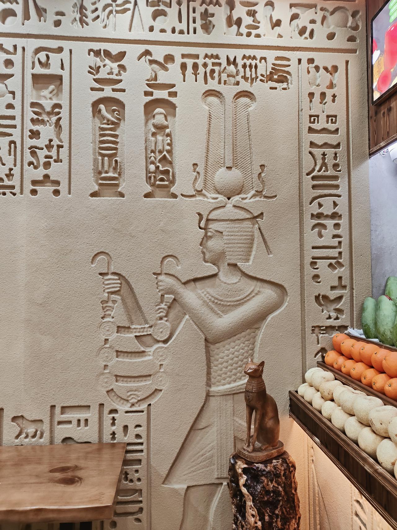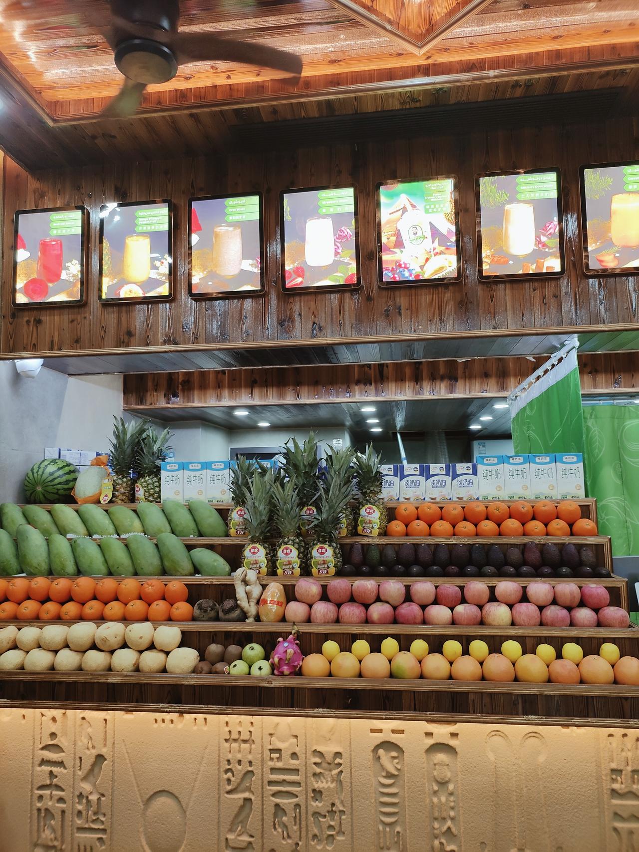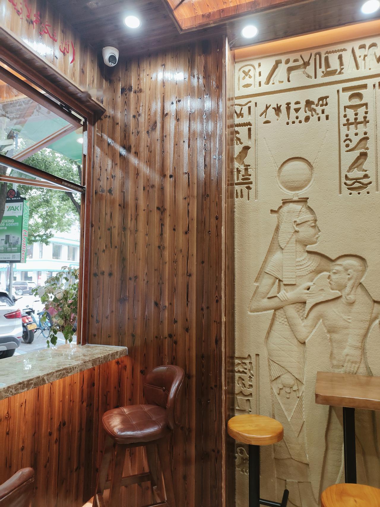 来都来了,还是要试试这杯雷锋果汁,老板正好在店里,他普通话挺标准的,点了一杯牛油果坚果椰枣奶昔,感觉没有加多少冰,非常浓稠,可以把杯子倒过来,里面有坚果碎椰枣香,甜度刚好,味道挺好的,口感很天然。店里是埃及法老风,装修挺有意思的!网红饮料 义乌美食