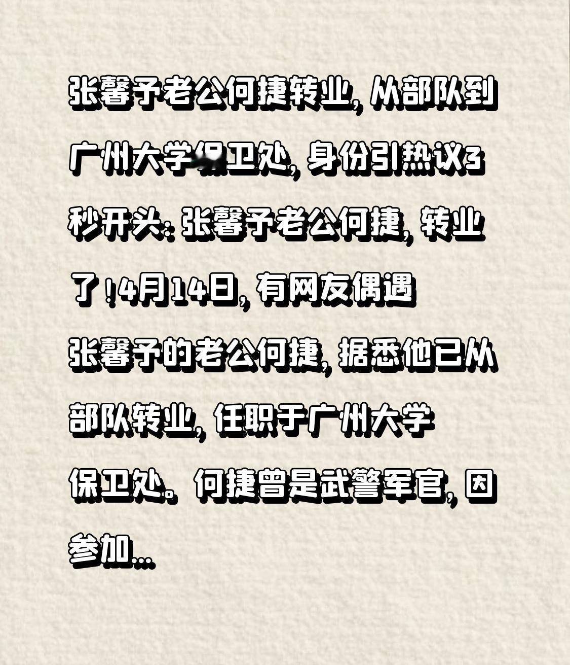 张馨予老公何捷转业,从部队到广州大学保卫处,身份引热议 3秒开头:张馨予老公何捷