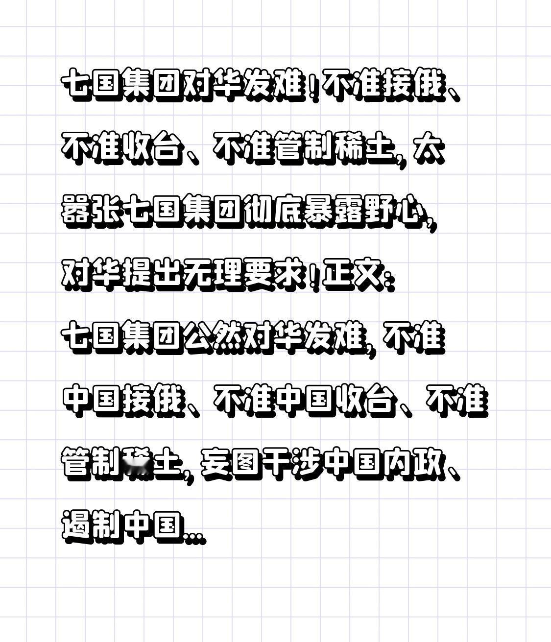 正文:七国集团公然对华发难,不准中国接俄、不准中国收台、不准管制稀土,妄图干涉中国内政、遏制中国发展。