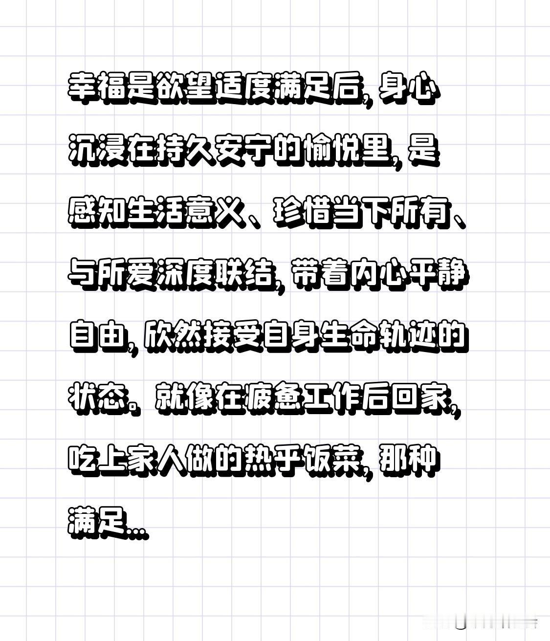 幸福是欲望适度满足后,身心沉浸在持久安宁的愉悦里,是感知生活意义、珍惜当下所有、与所爱深度联结,带着内心平静自由,欣然接受自身生命轨迹的状态。就像在疲惫工作后回家,吃上家人做的热乎饭菜,那种满足与安宁,就是幸福。而且现代心理学研究表明,40%的幸福感能靠有意识的选择和行动培养,所以幸福并非遥不可及,我们可以主动去追寻。