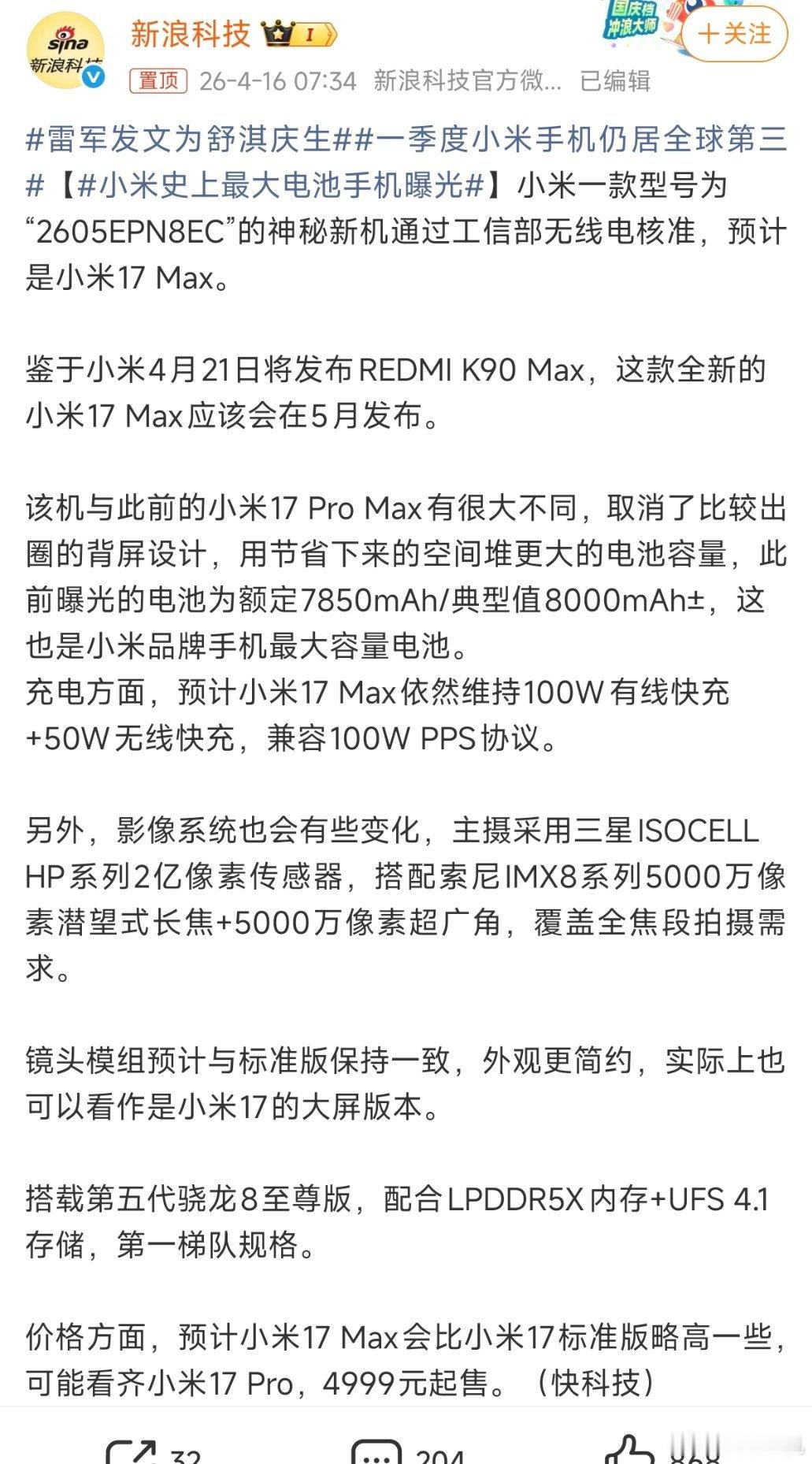 小米17max也要来了,省流就是取消了背屏设计,增加了电池容量,主摄和长焦更换了传感器,其他设计基本不变。