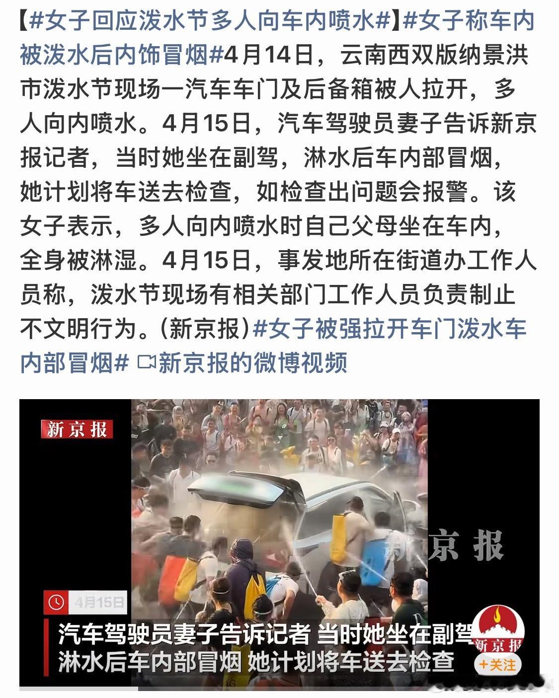 女子回应泼水节多人向车内喷水这根本不是现场的热情游客…应该叫坏种这个拉开后备箱的人,真的不需要赔偿吗??车内的线束、模块、车窗等电机部分之类,都需要去门店检查…🧐打着过节的名义行凶,这再也不是我心中的泼水节了……💔