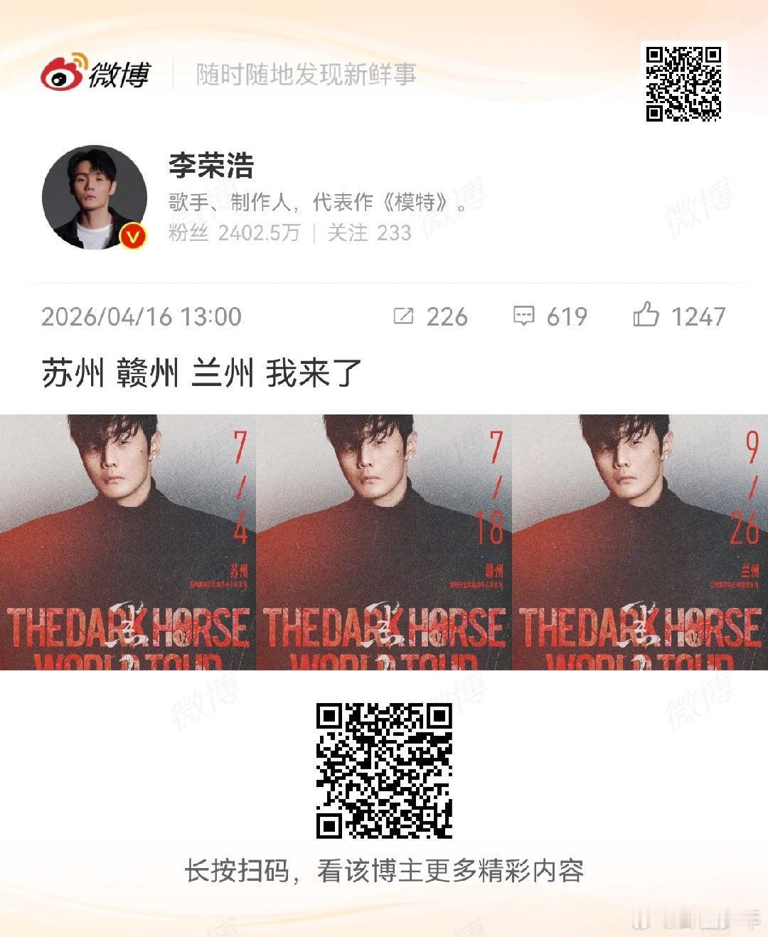 李荣浩演唱会官宣苏州赣州兰州李荣浩苏州赣州兰州演唱会官宣,7.4苏州、7.18赣州、9.26兰州,你做好抢票冲现场的准备了吗?