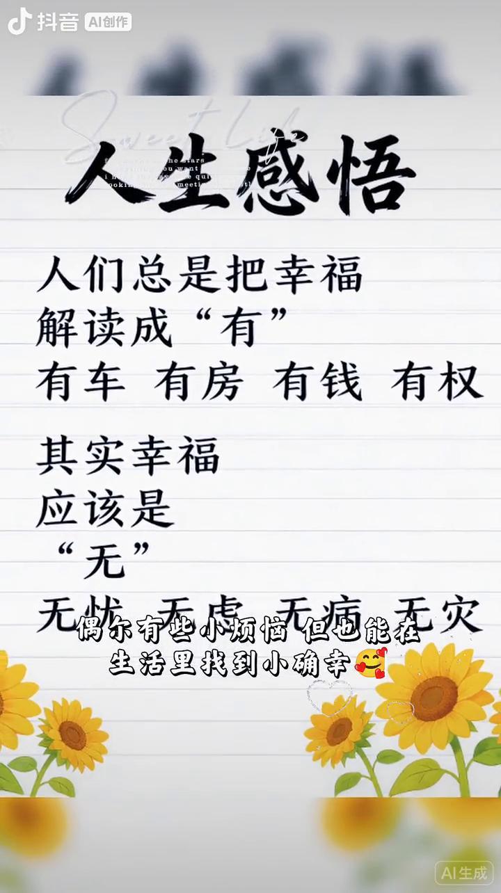 人生感悟。 人们总是把幸福解读成"有",其实幸福应该是:无忧、无虑、无病、无灾。