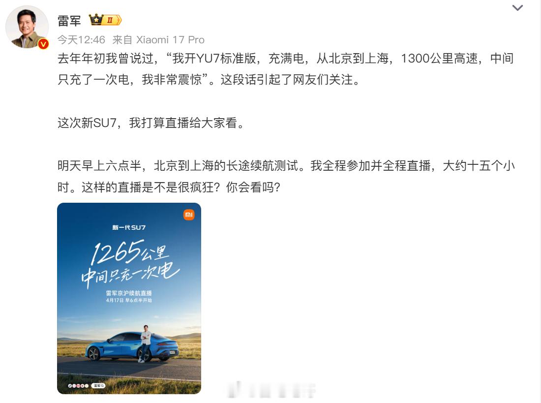 这样的直播确实够疯狂雷总你敢直播我们就敢看雷军直播北京到上海只充一次电