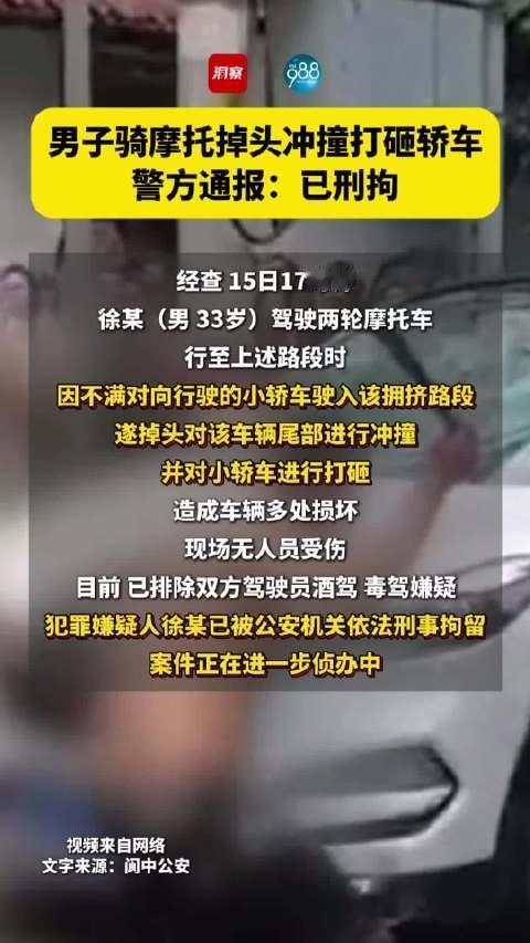 街头众目睽睽之下,荒唐一幕接连上演。徐某不顾周边来往行人安全。驾驶摩托车猛然调转行驶方向。径直朝着正常行驶的小轿车猛烈撞击。剧烈碰撞带来巨大声响。周围路人纷纷侧目围观。失控情绪依旧没有半点平复。徐某随即跳下摩托车。徒手对着小轿车车身多处位置疯狂砸踹。车身外观遭到严重损坏。公共道路正常通行秩序遭到严重破坏。周边群众出行安全遭到严重威胁。现场场面触目惊心。围观群众无不连连摇头。