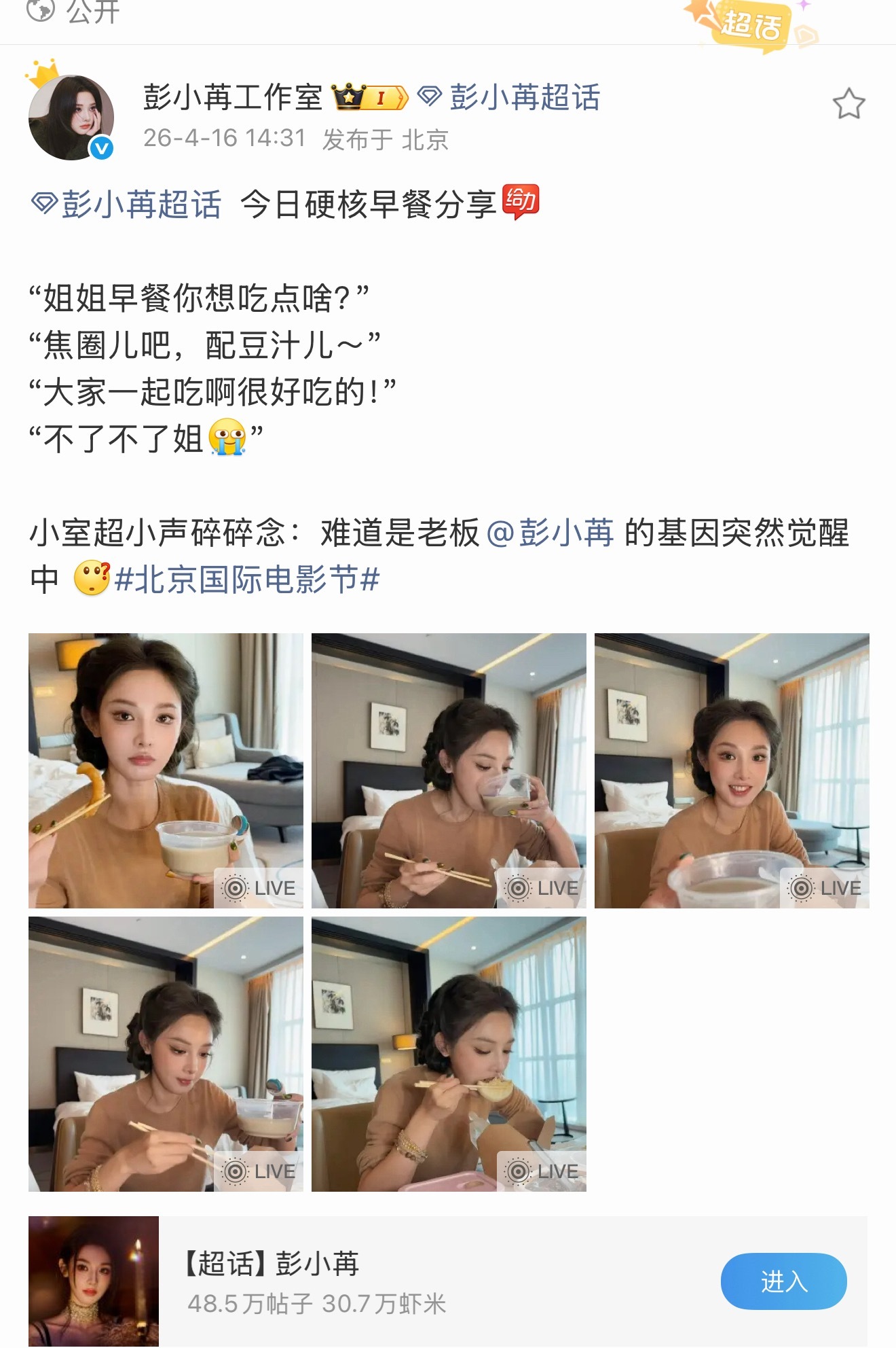 彭小苒走红毯前喝豆汁 北京国际电影节彭小苒的美图我搜走了,但是豆汁留给你们。我就