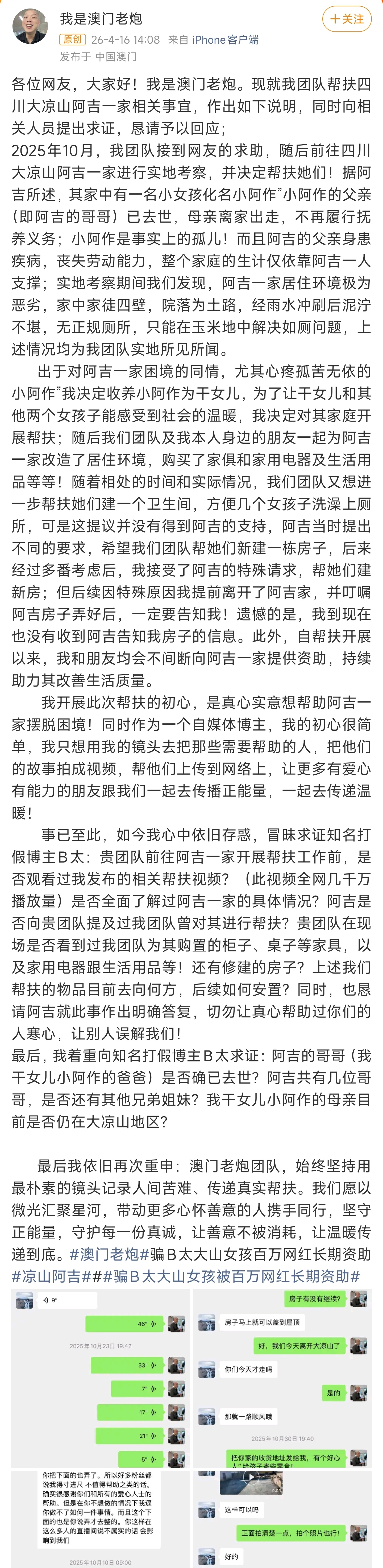 他强调帮扶初心是传递正能量,同时就相关事宜向博主B太、阿吉本人求证,质疑B太团队帮扶前是否知晓自己的前期帮扶、现场是否看到其购置的物品及物品去向,还求证小阿作父亲是否真去世、阿吉的兄弟姐妹情况、小阿作母亲是否仍在大凉山。