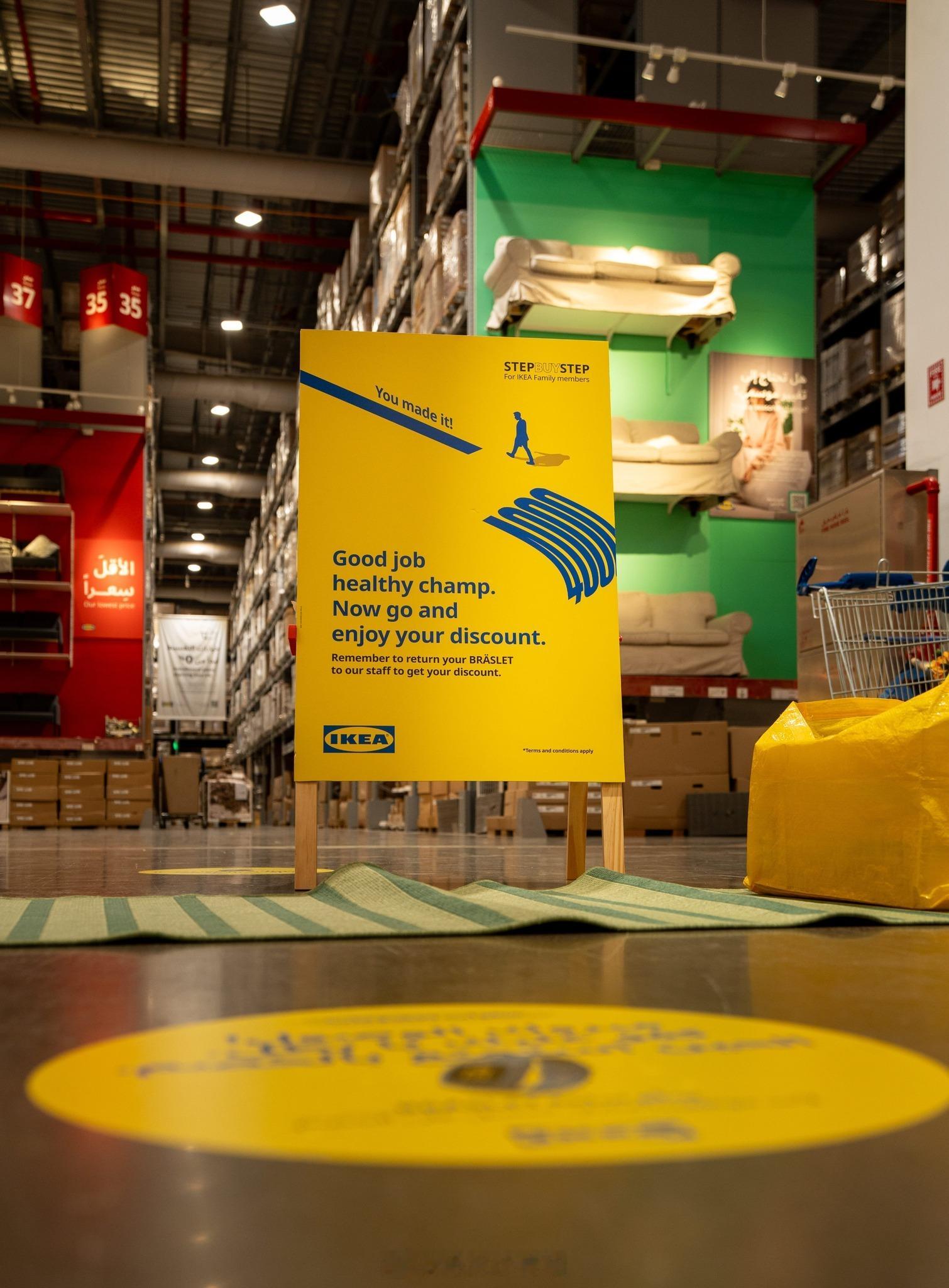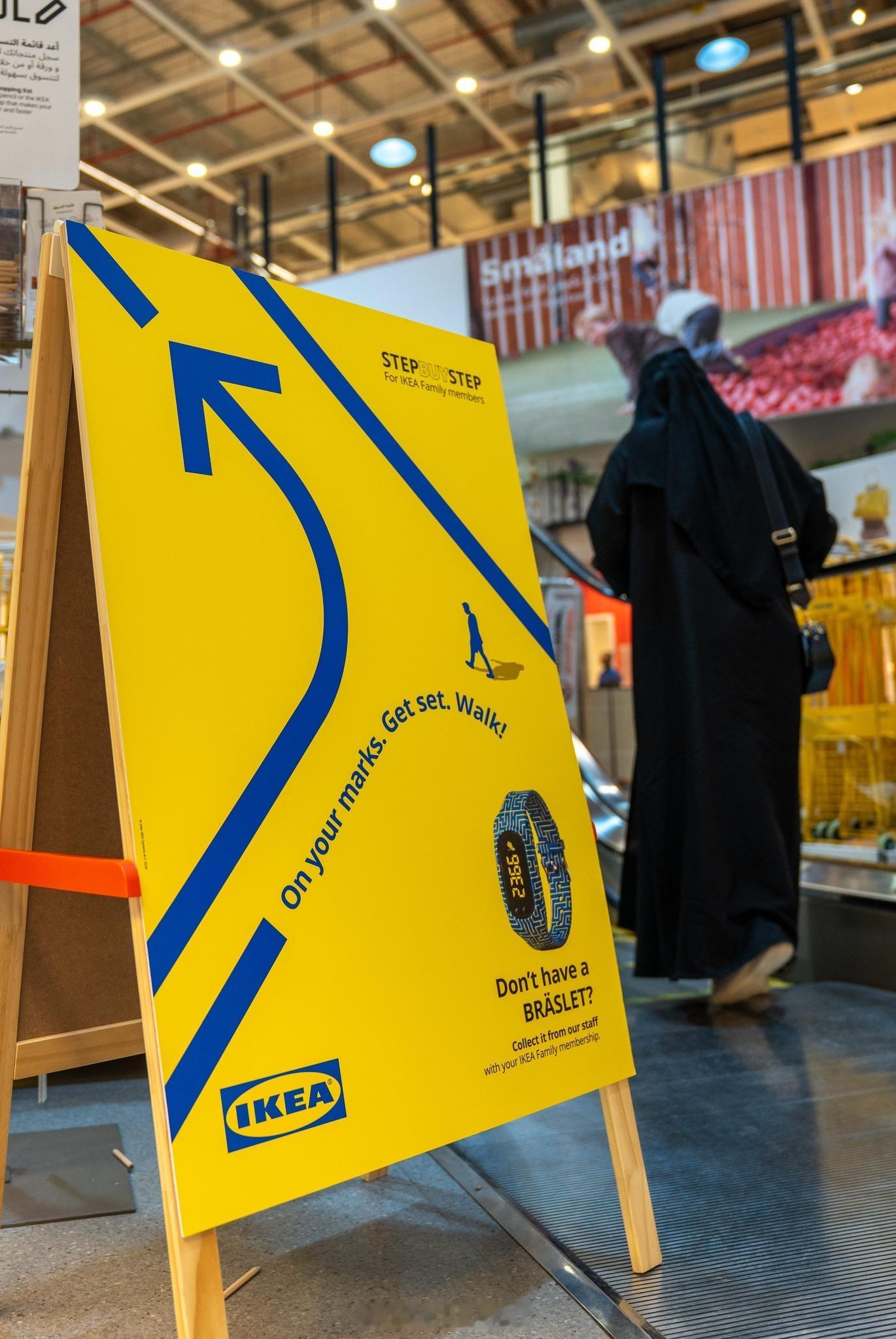 沙特阿拉伯的宜家 IKEA 做了个非常有趣的营销“STEP BUY STEP”。进店领一个计步手环,只要在店里能走超过4000步,结账时就有9折。通过“多运动”并提供折扣的方式化解店内动线过于复杂的槽点,很厉害。