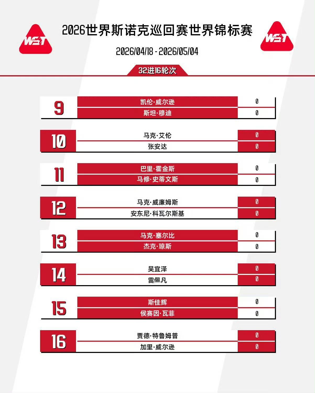 另外,范争一VS墨菲,庞俊旭VS罗伯逊,张安达VS艾伦,斯佳辉VS瓦菲,丁俊晖VS吉尔伯特。