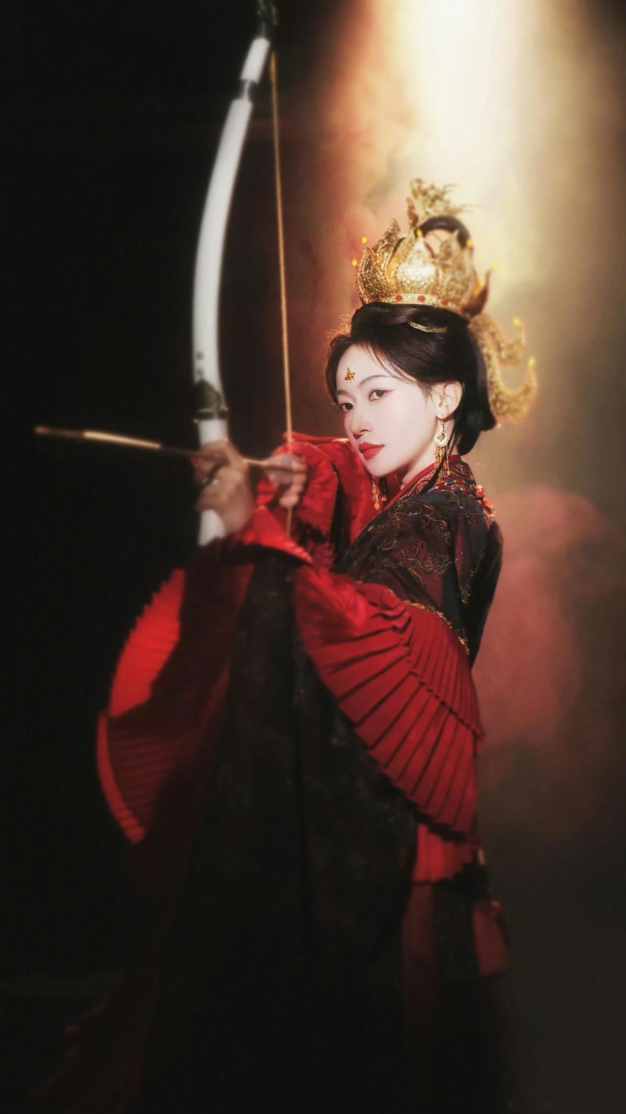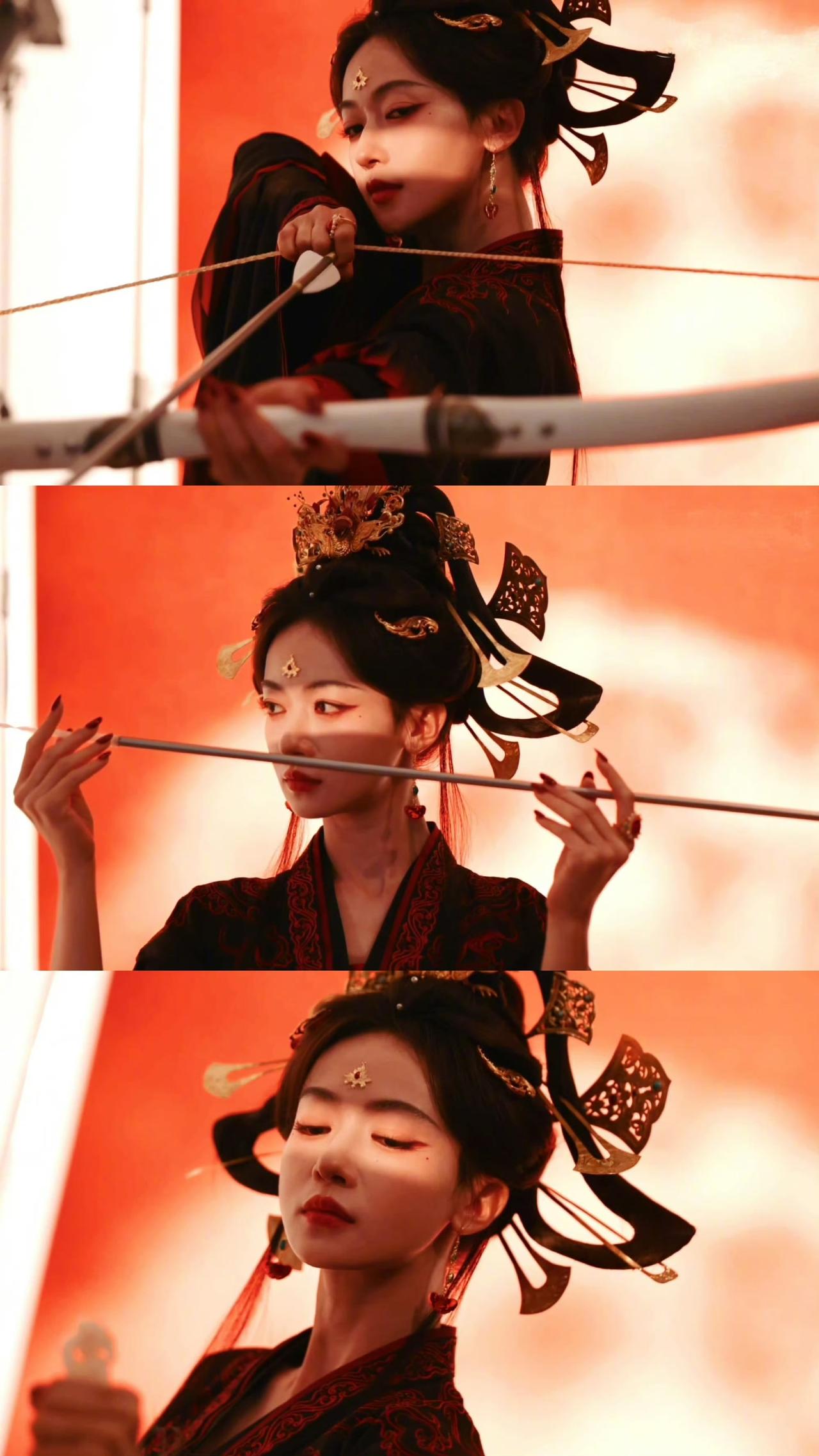 从慵懒倚榻的破碎感,到挽弓拉满的杀伐气,吴谨言把复仇女主的破碎与锋芒焊在了造型里。