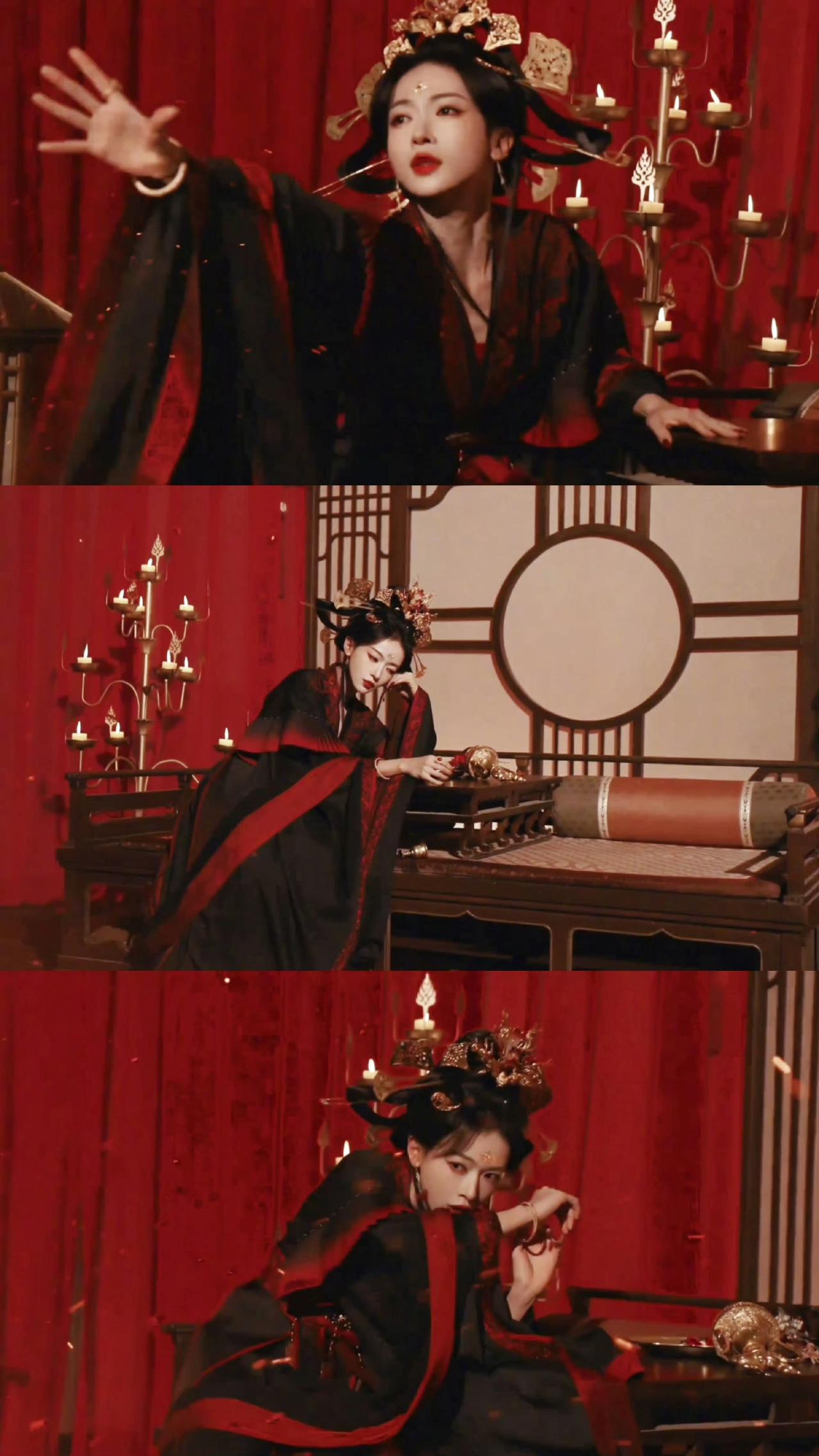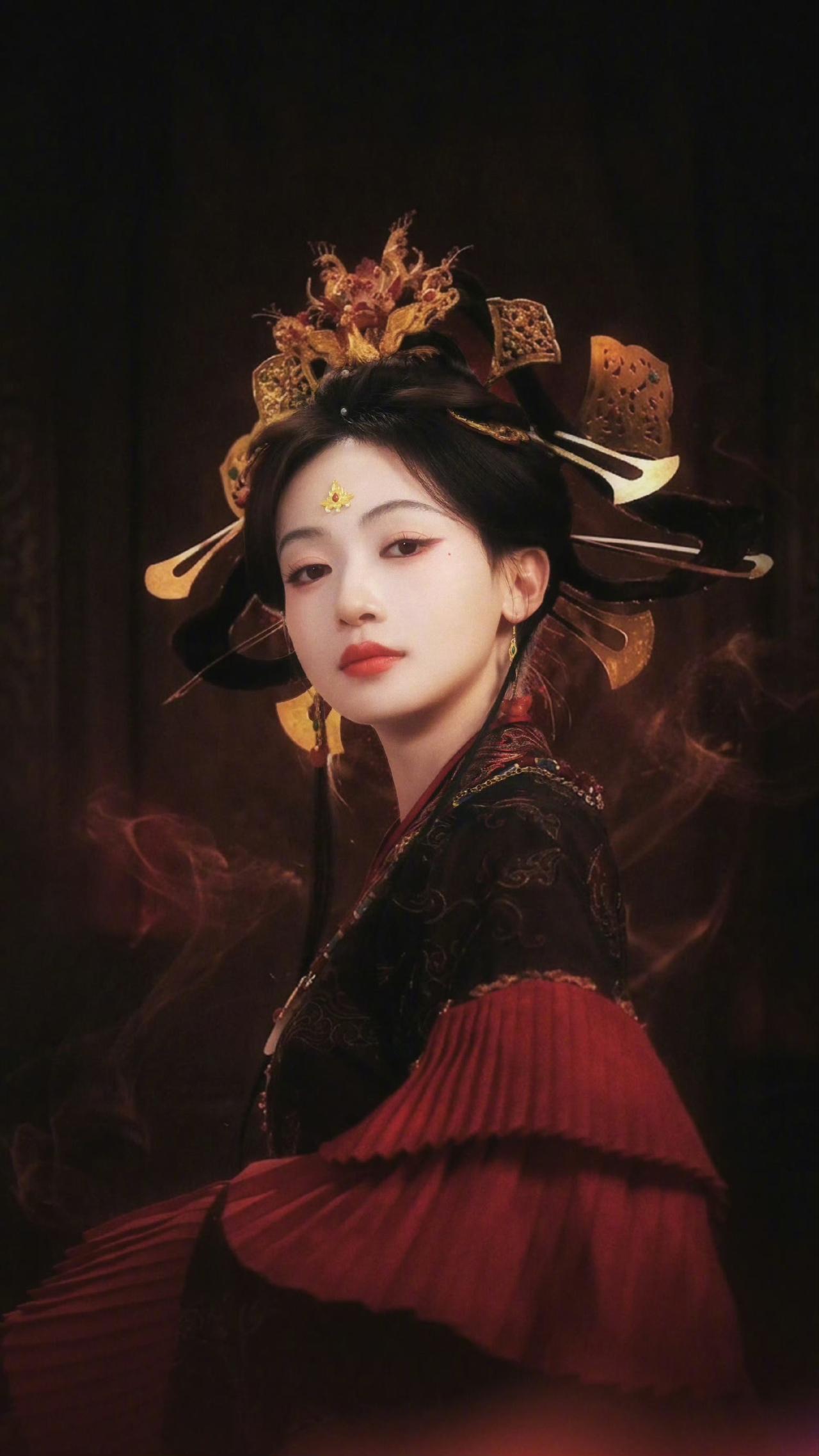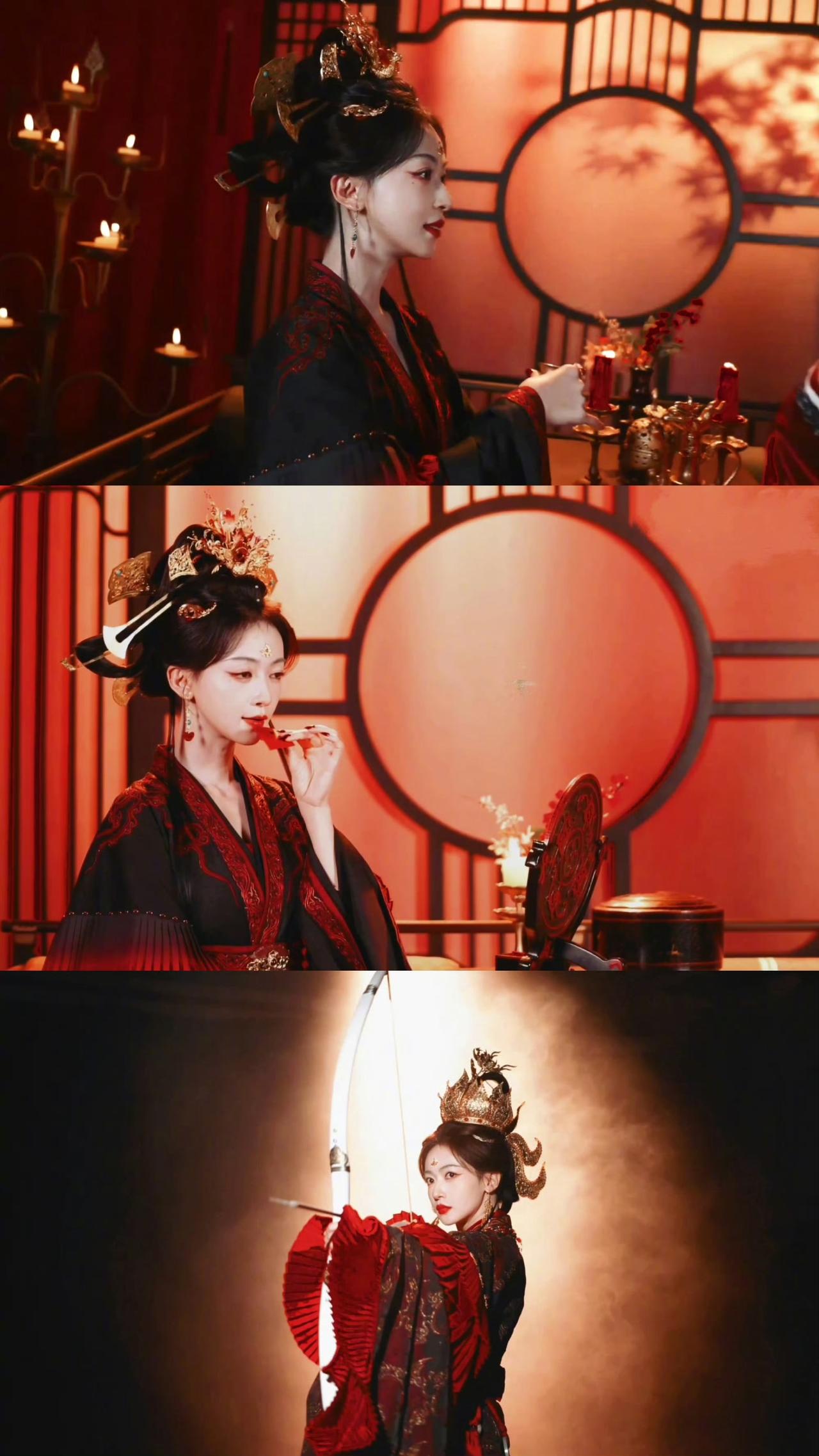 黑红织金婚服,鎏金凤冠斜插,飞翘发式带着魏晋的疏狂,额间花钿一点,眼尾红妆添了几分妖冶狠戾。