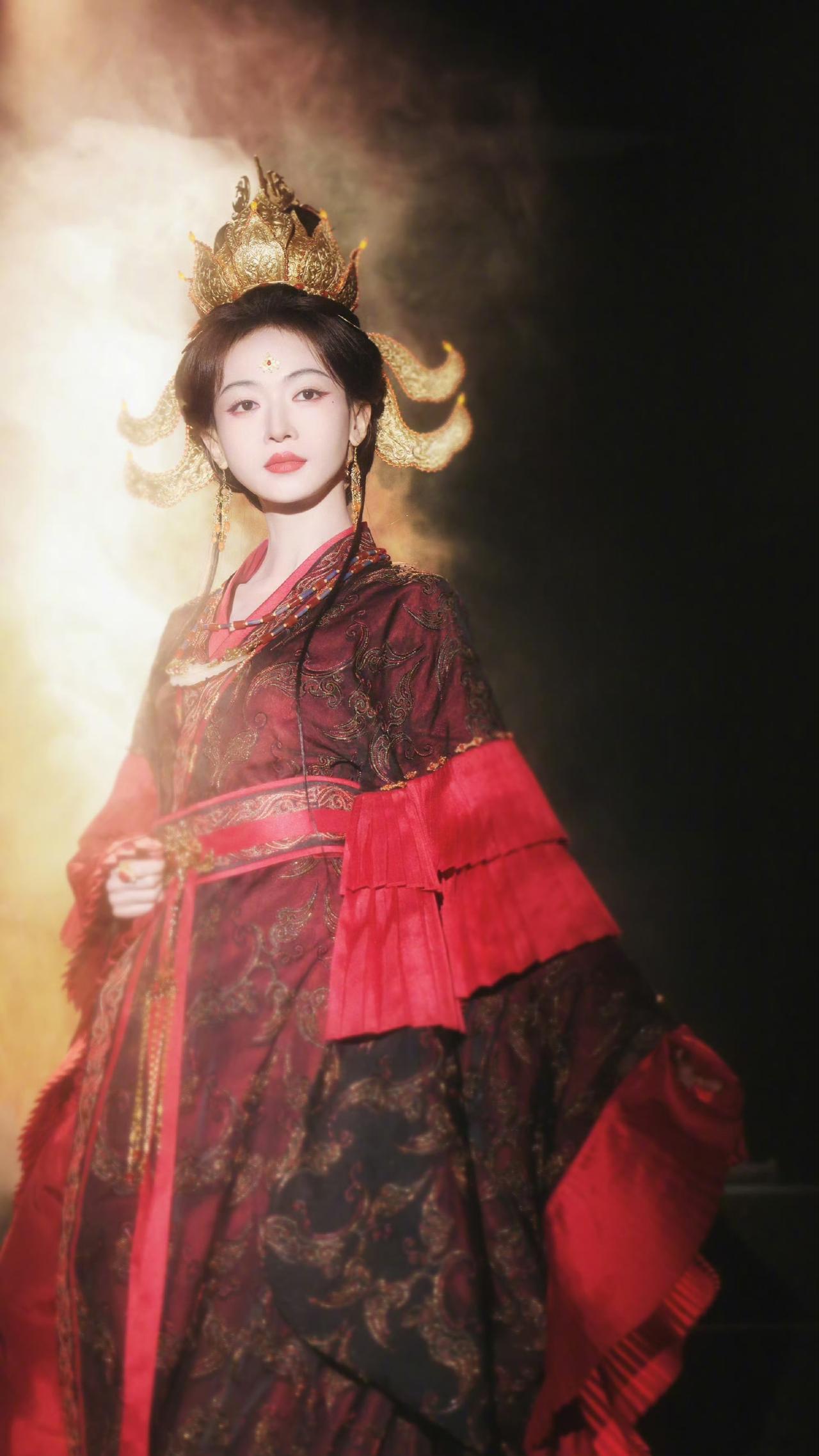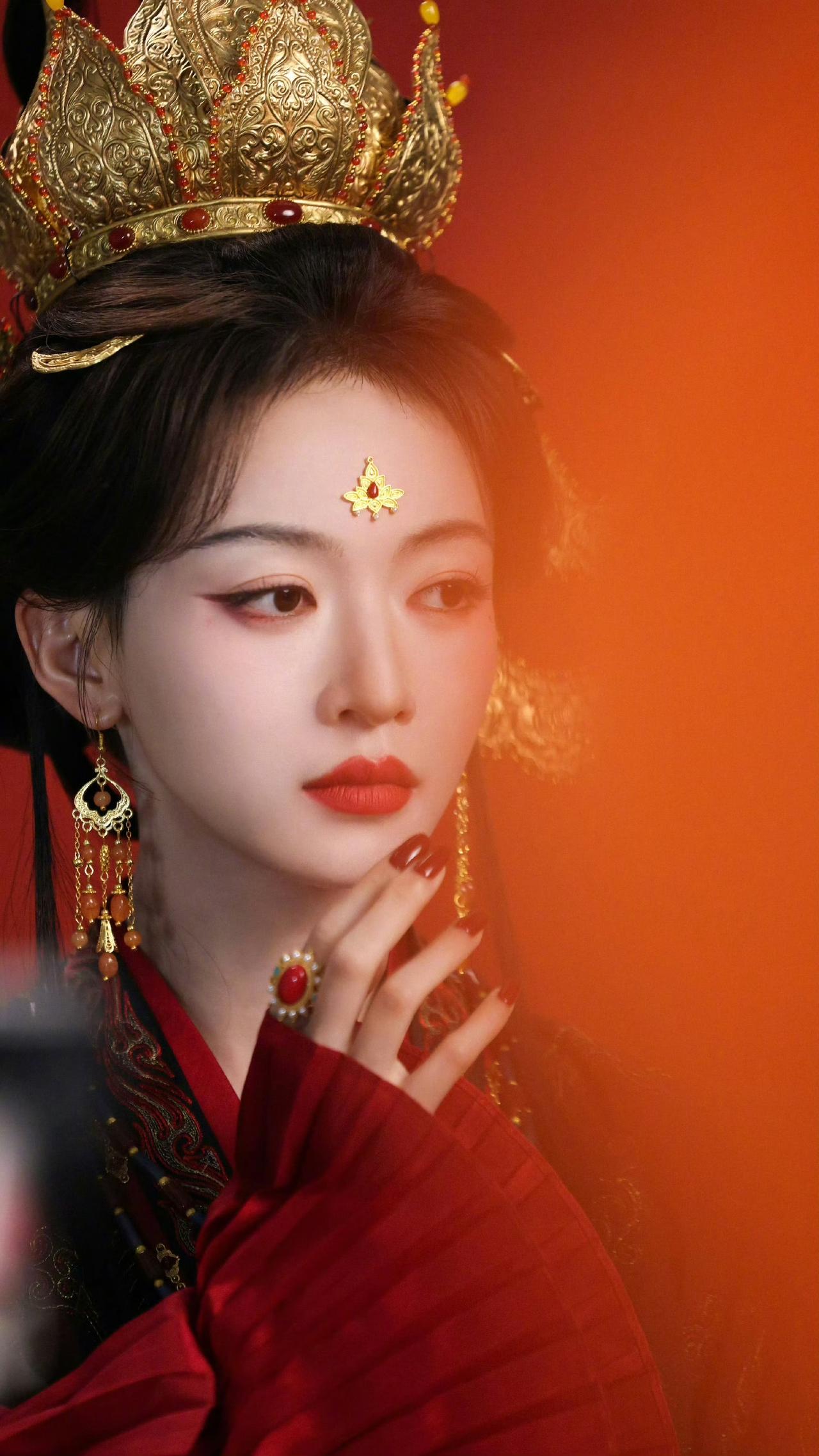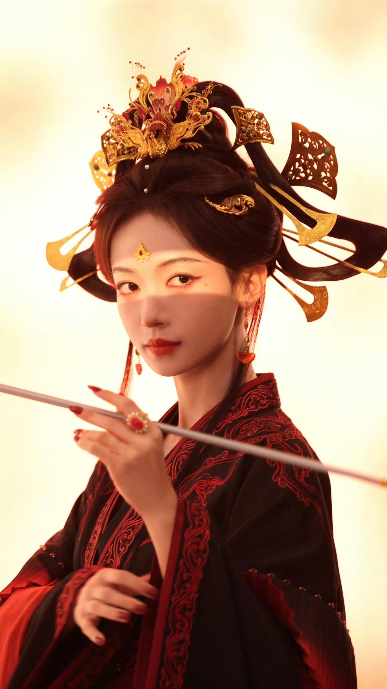 黑红织金婚服,鎏金凤冠斜插,飞翘发式带着魏晋的疏狂,额间花钿一点,眼尾红妆添了几分妖冶狠戾。