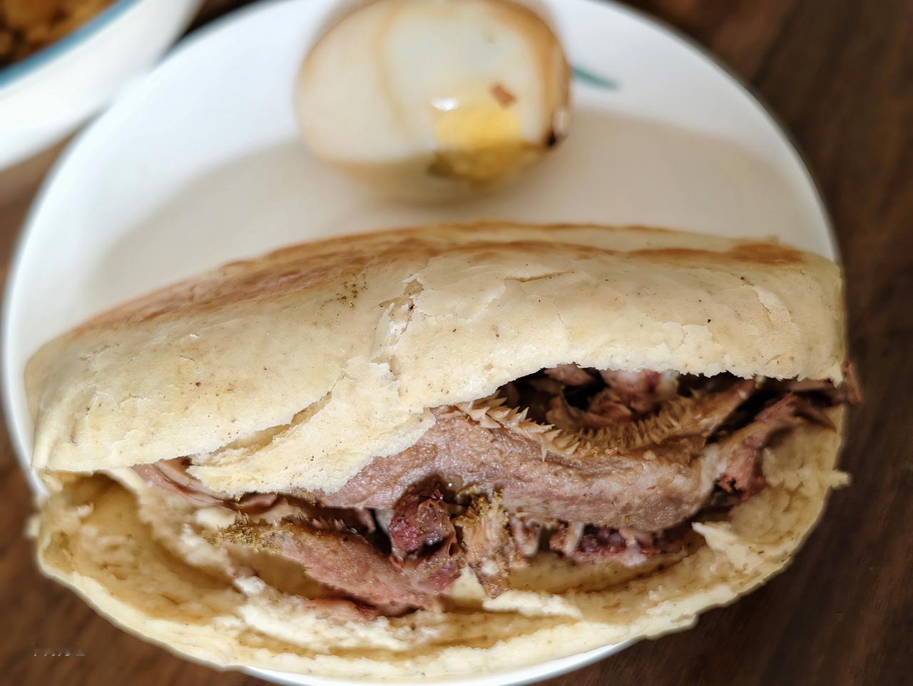 硬核早餐:大火烧夹羊头肉。昨天朋友从宁夏给我带了两个羊头,拆分开后,晚餐吃了多半个,剩下的留到早晨。买个大火烧,撒上椒盐,夹上羊头肉,尽情享受这美味!