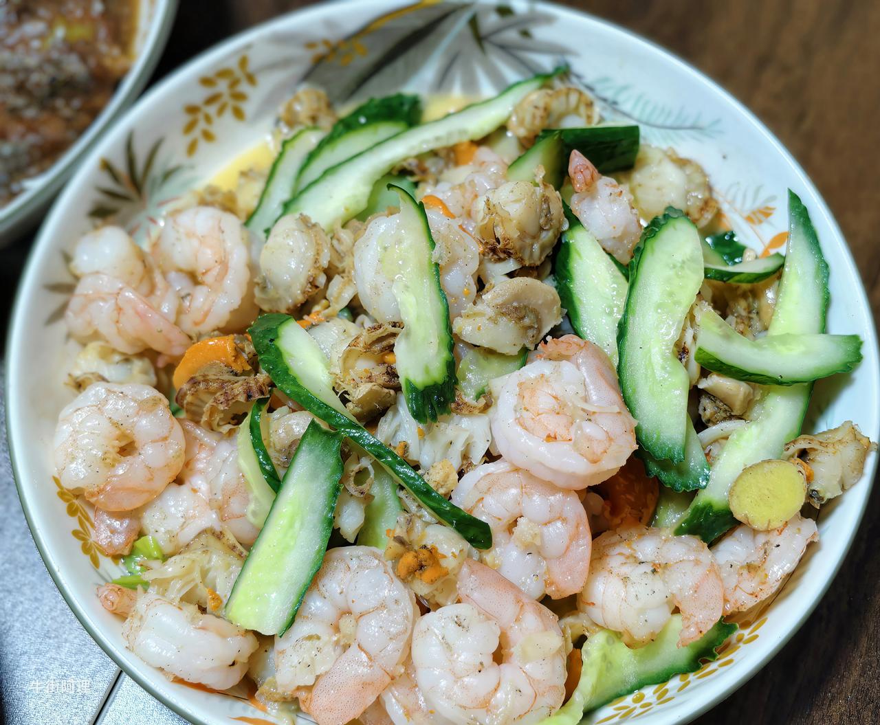 中午,儿子、儿媳领着孙子来到牛街。我忙不迭地就着冰箱里的食材,做了几道家常菜:炒虾仁扇贝、白灼虾、炖带鱼、炖童子鸡、青椒炒羊肉、小白菜豆腐,还有香椿炒鸡蛋。