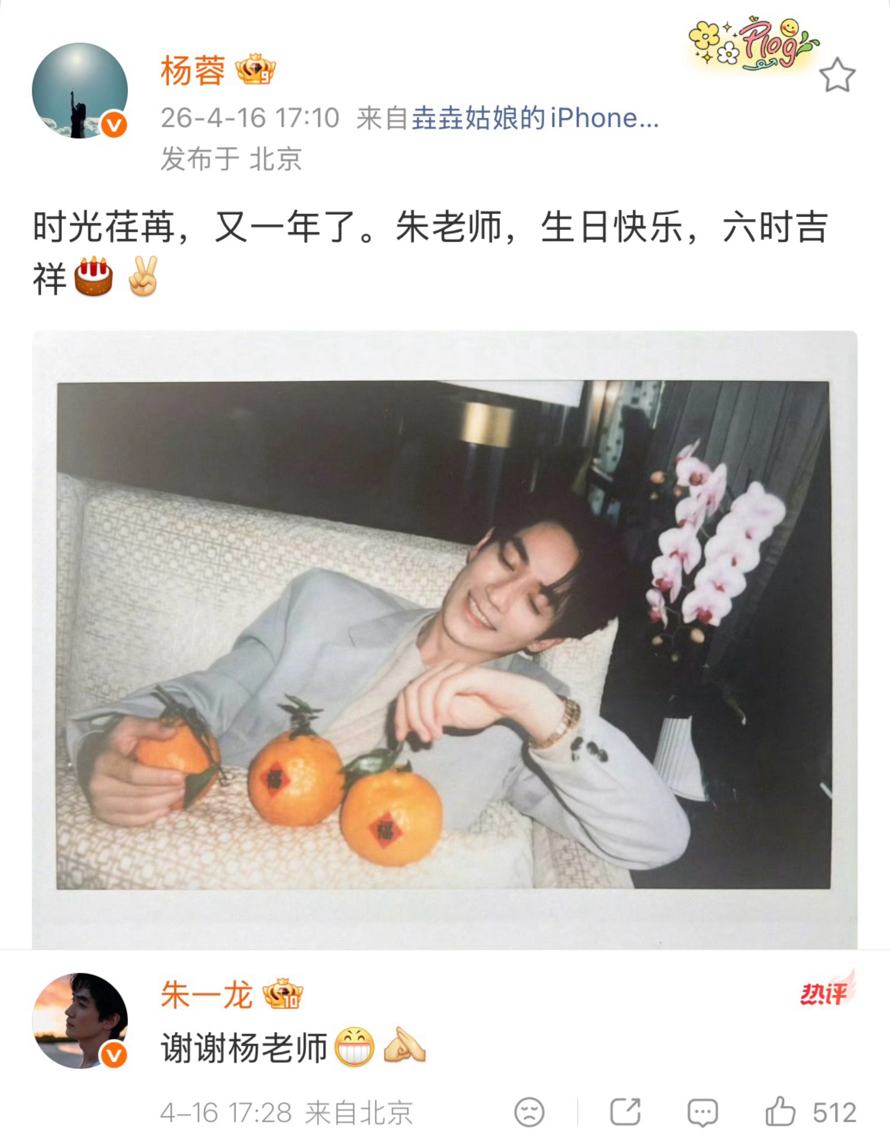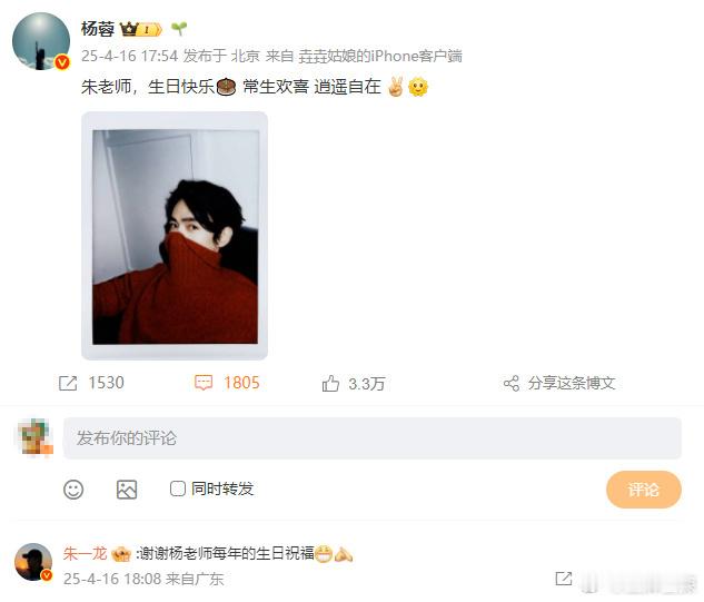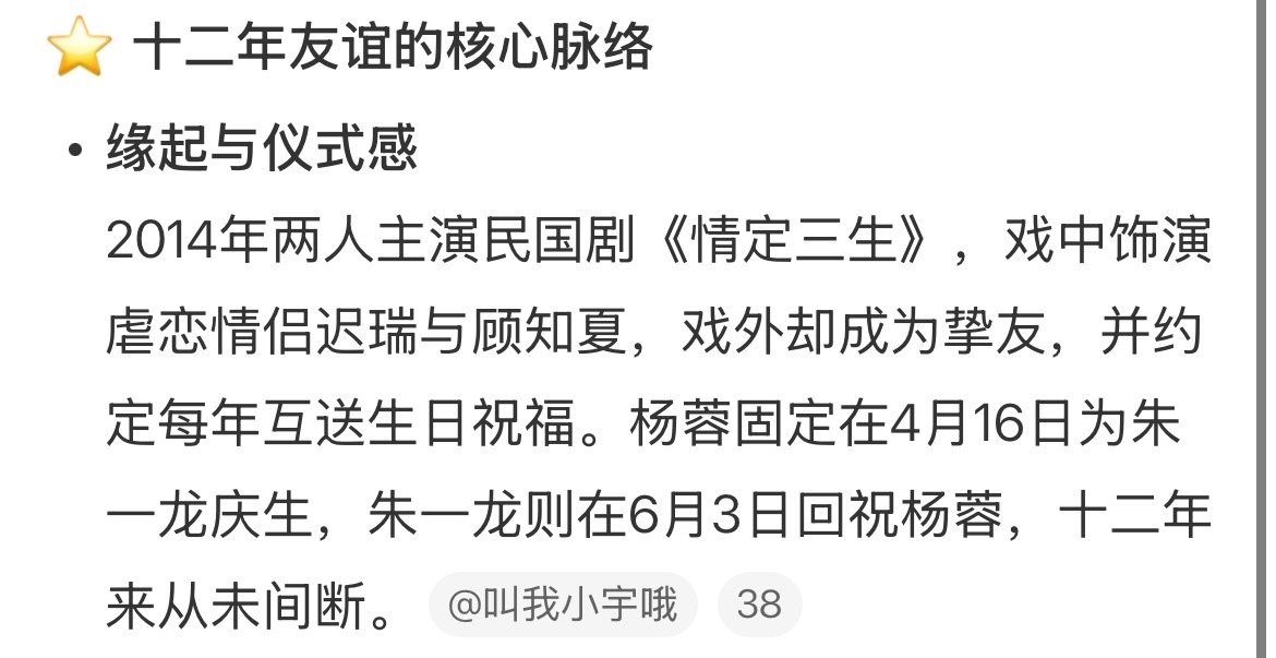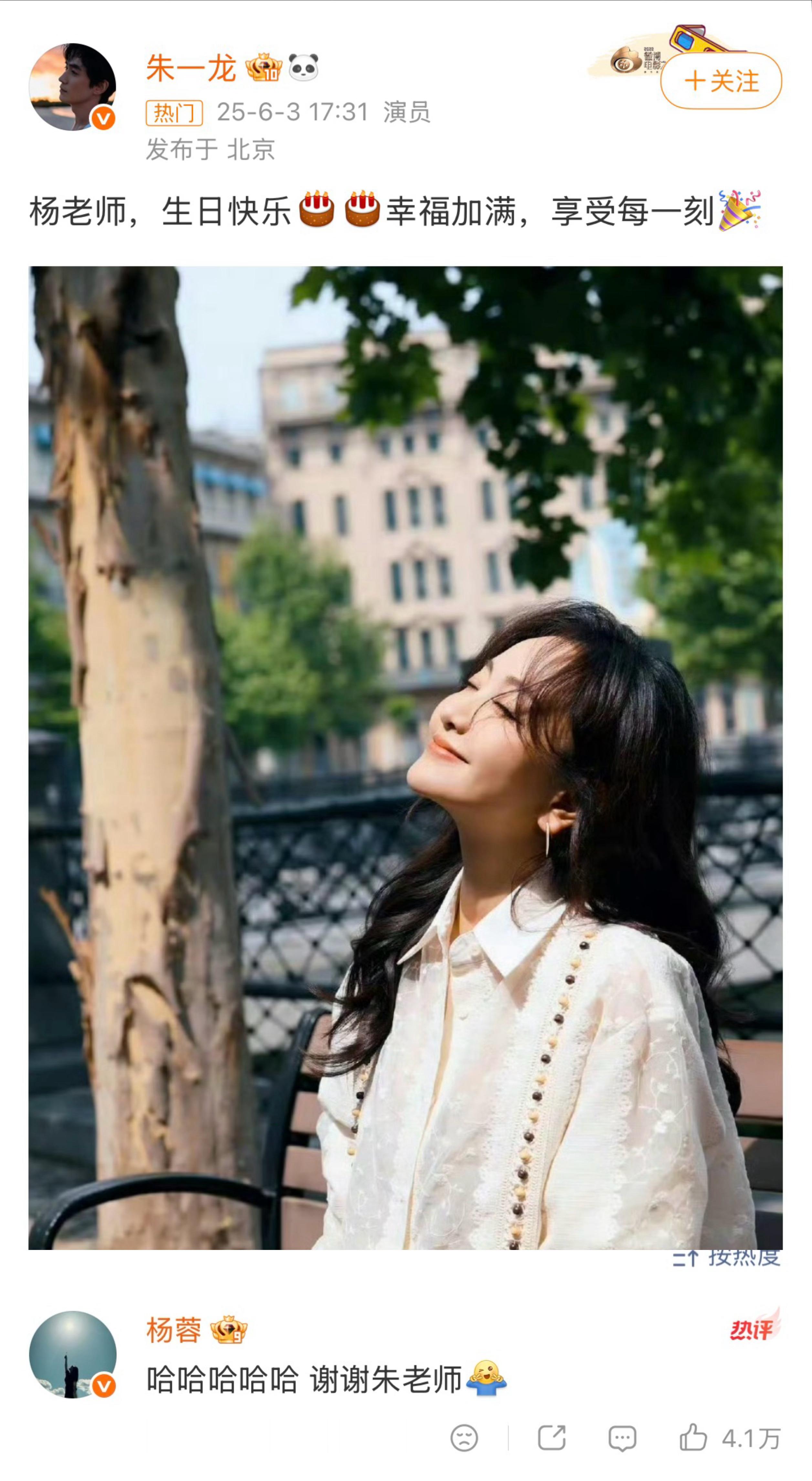 杨蓉朱一龙12年友谊 杨蓉连续十二年给朱一龙庆生 蓉妹又来给朱老师庆生啦~连续十二年的庆生,低调却永远都在的友谊,谁说内娱没有真友情的两位友谊天长地久!!!朱老师也回复啦~杨蓉 朱一龙 春日心动放映季