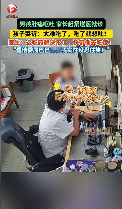 医生有些意外,问他为什么不吃东西呢?原来,孩子嫌学校里的饭太难吃了,根本难以下咽。现在更是吃了就吐。医生这下子明白了,孩子这就饿的,饿过头了。就对他父亲说,这个不是药能治好的,赶紧先带着孩子去吃饭。