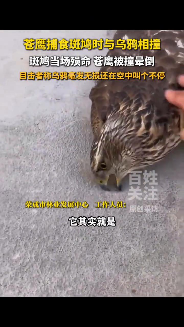 老鹰捕食斑鸠时与乌鸦相撞纷纷坠地,苍鹰当场晕倒,乌鸦毫发无损。