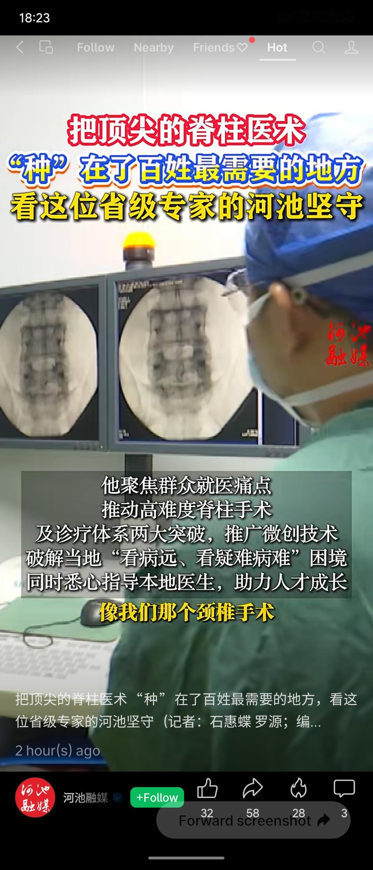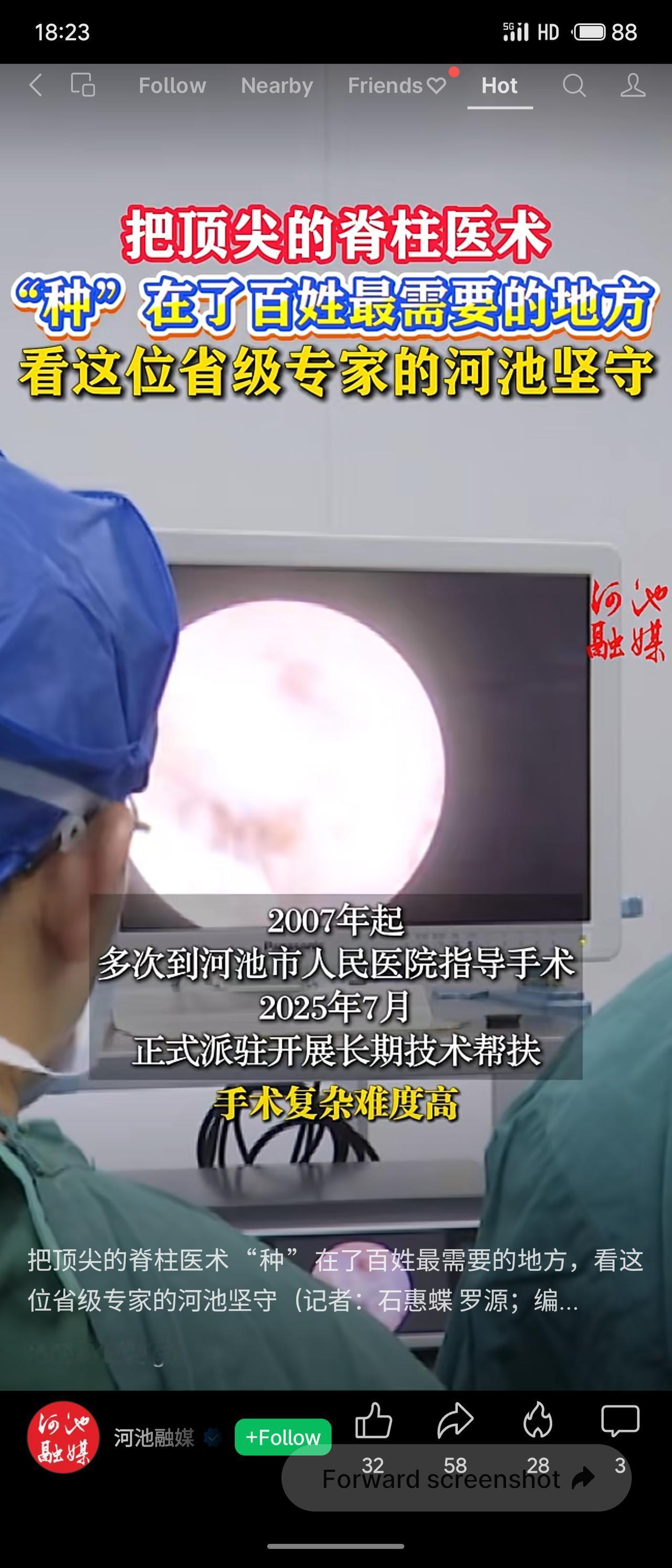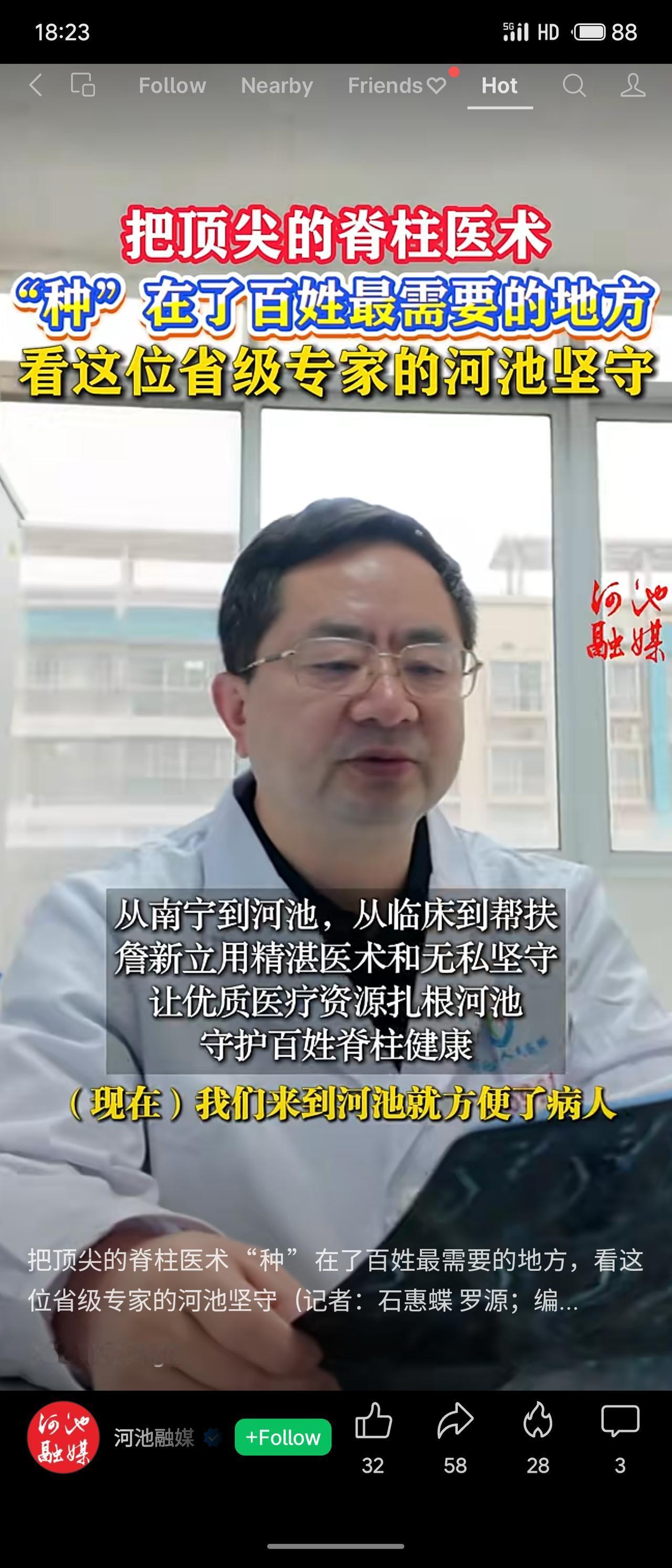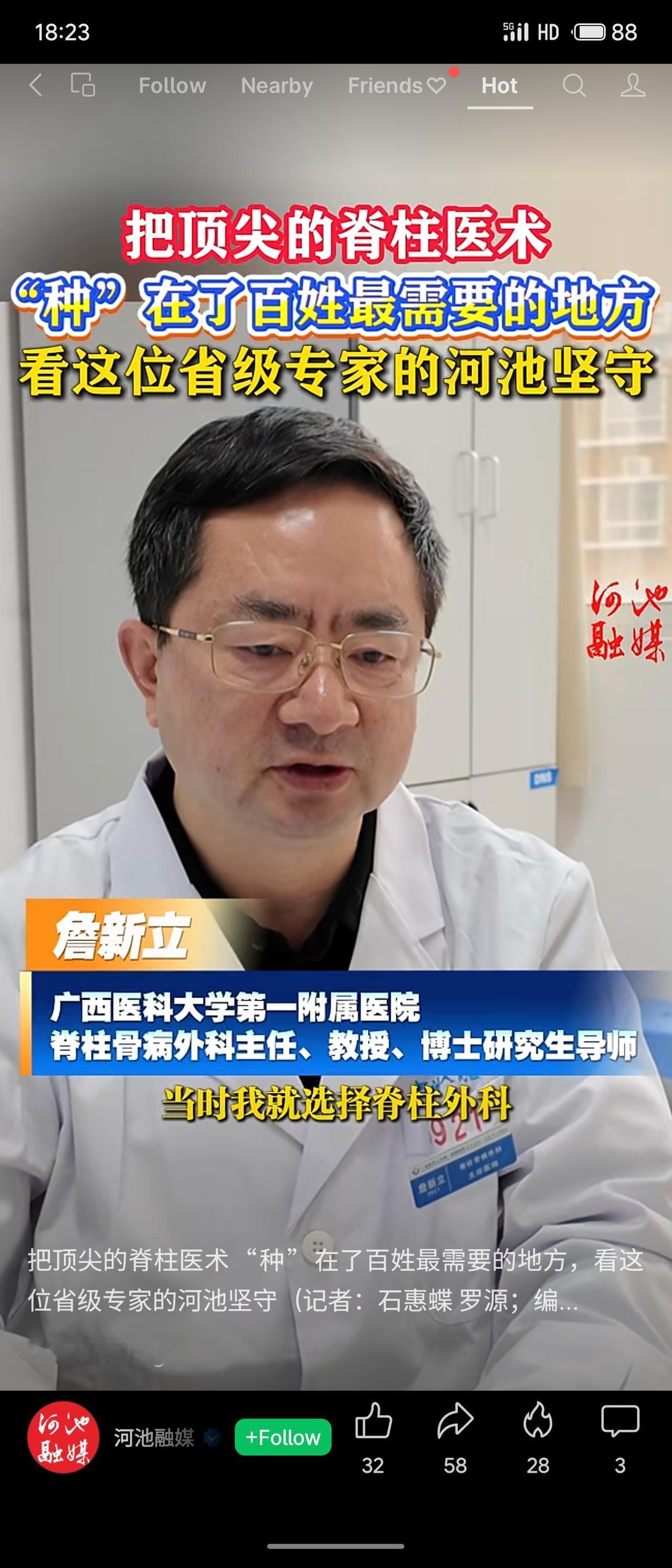 省级专家詹新立教授自2007年起多次赴河池指导,2025年7月正式派驻河池市人民医院。他聚焦基层就医痛点,推动高难度脊柱手术与微创技术落地,破解当地“看病远、看疑难病难”困境,同时悉心培养本地医生,实现技术“造血”。从南宁到河池,他用二十余载精湛医术和无私坚守,将优质医疗资源“种”在百姓最需要的地方。