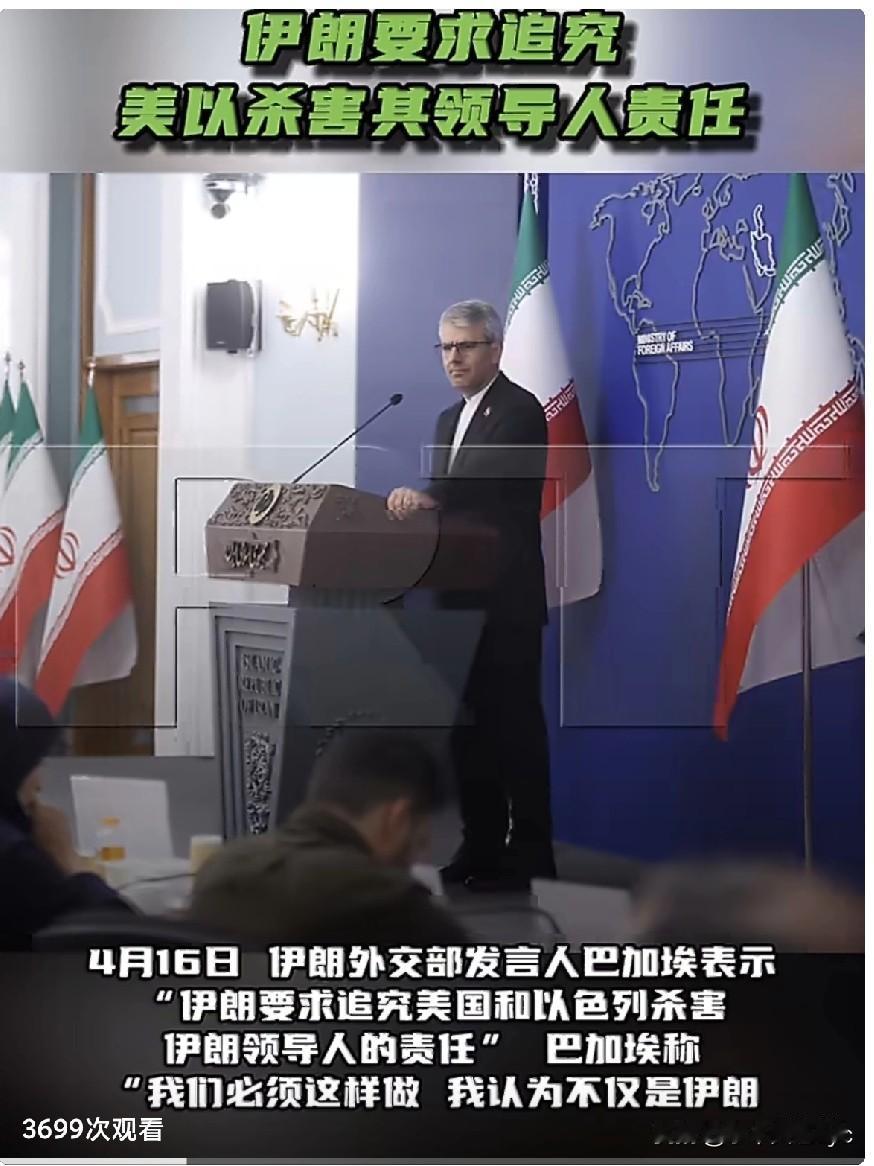 4月16日,伊朗外交部发言人巴加埃表示,“伊朗要求追究美国和以色列杀害伊朗领导人的责任”。